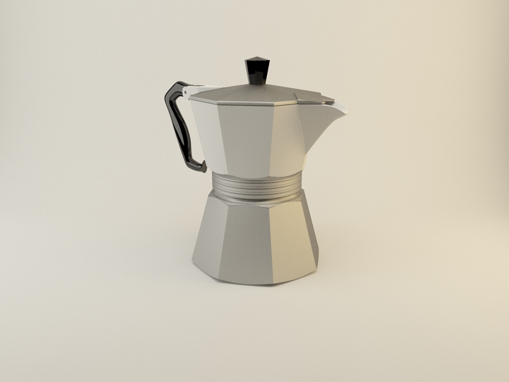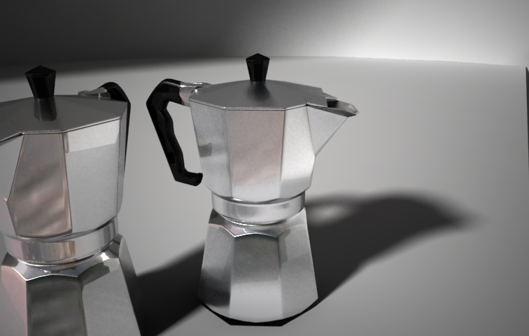 volevo chiedervi un parere su questa immagine...mi sono creato il mio set con illuminazione da studio e volevo sapere che ne pensate. la caffettiera è un modello scaricato liberamente dalla rete, i piccoli puntini neri sulla sua superficie sono dati dal materiale che non è piano ma presenta delle asperità.