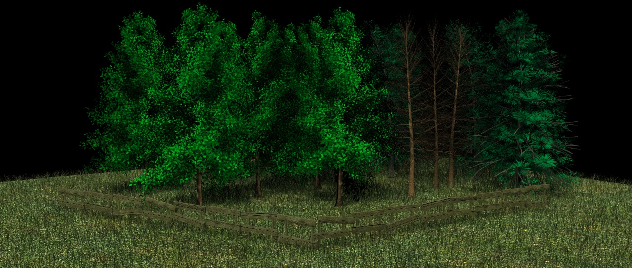 Per quanto riguarda gli alberi, SE l'inquadratura sarà frontale o tipo quelle presentata, consiglierei direttamente dei piani alfa con alberi in 2D...si risparmierebbe parecchio calcolo, anche perchè se ho ben capito dovranno essere di SFONDO...e quindi magari anche sfocati per dare profondità!