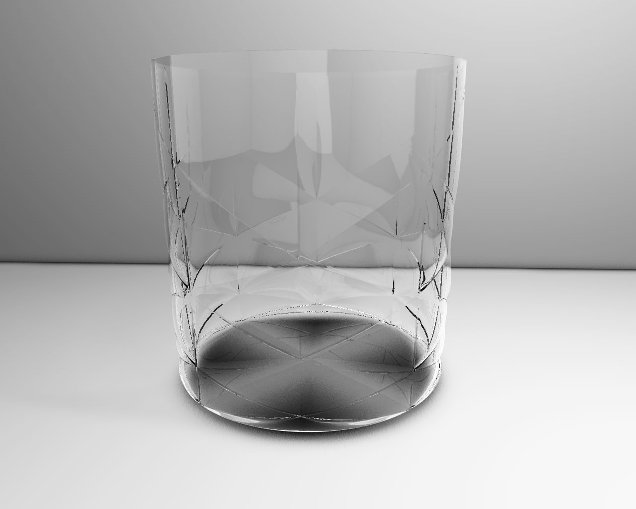 per quello che ne posso capire notavo l'ombra sotto il bicchiere non pu' secondo voi essere prodotta dalle pareti del bicchiere stesso dato che forma una x pensavo che potessero essere le forme geometriche a punta del bicchiere a fare più ombra dove convergono nelle piccole punte che lo compongono, forse sto sbagliando ma rendere non visibile il piano all'ombra del bicchiere puo' essere una soluzione?