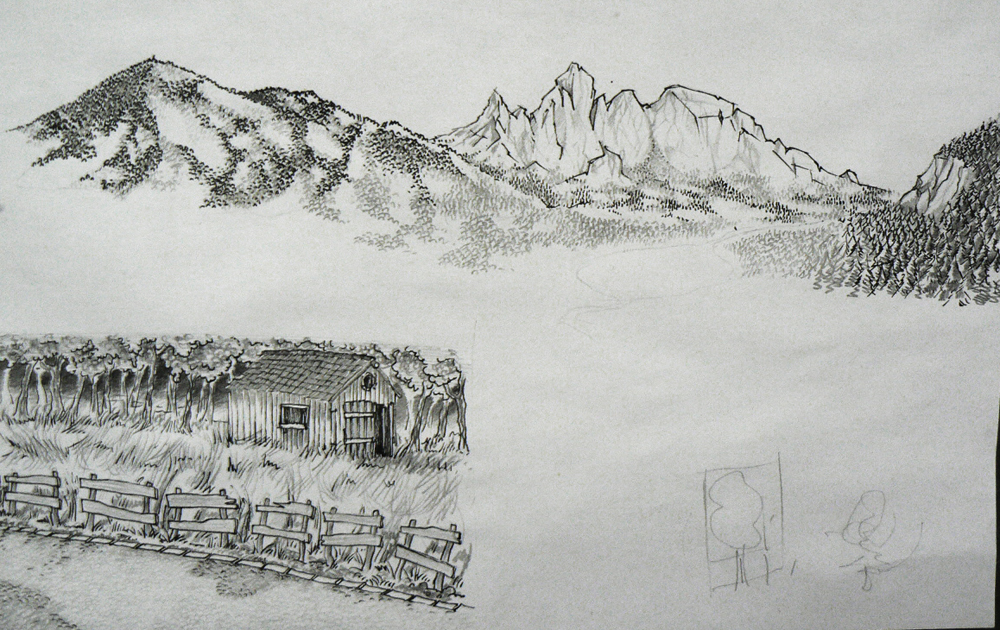 Ieri ho fatto un disegno per focalizzare in parte ciò che voglio/vorrei per il panorama ... è proprio una cosa che non riesco a chiarirmi nel 3D, ... ci arriverò, ma nel frattempo continuo a dover creare materiale che mi dia una base su cui ragionare.