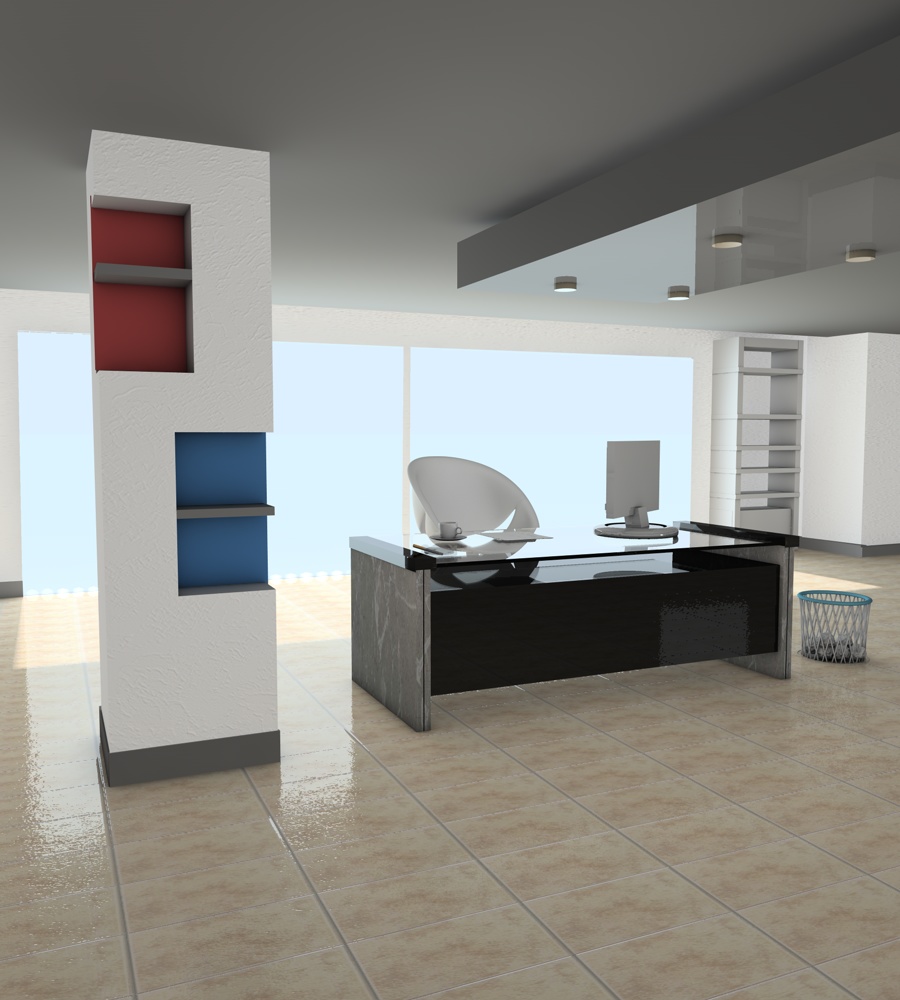 condivido quello che ha detto arcnello e inoltre agiungerei delle piante da interno. lo sfondo ce la fai a metterlo? o sennò potresti mettere delle tendine da ufficio.