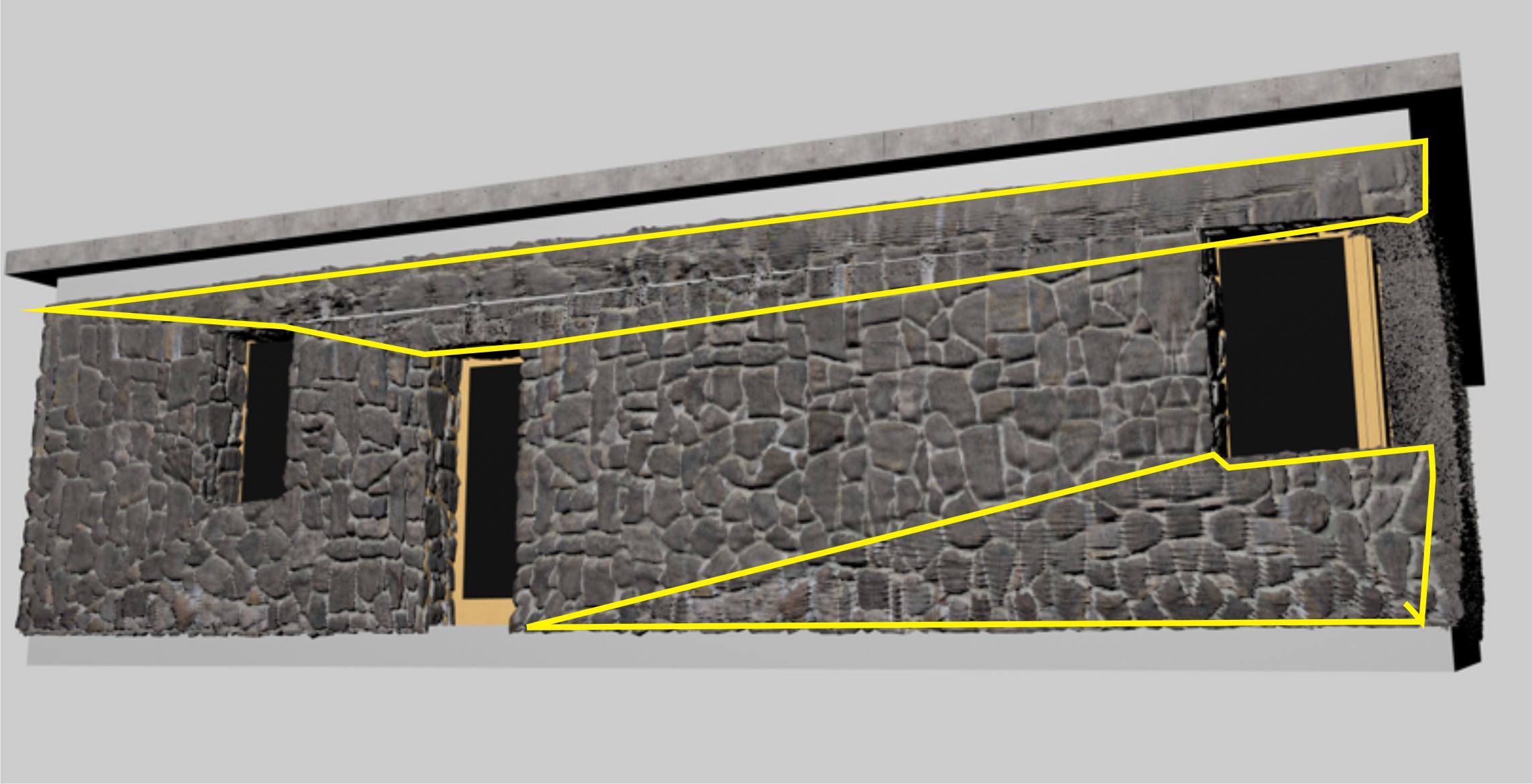 Il problema che mi si presenta nell'imagine ottenuta utilizzando i tre canali della texture (diffusione, specularità e displacement) è una strana deformazione della texture in corrispondenza di alcune zone dell'immagine, in alcuni trialngoli che compongono il poligono della facciata (come si vede dalle immagini allegate).