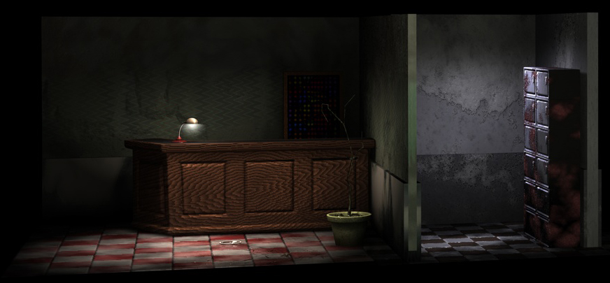 Nella scena manca ancora il piano dietro alla camera per le riflessioni, quindi sia vetrina che ingresso lasciano vedere molto di più quanto sta dietro.