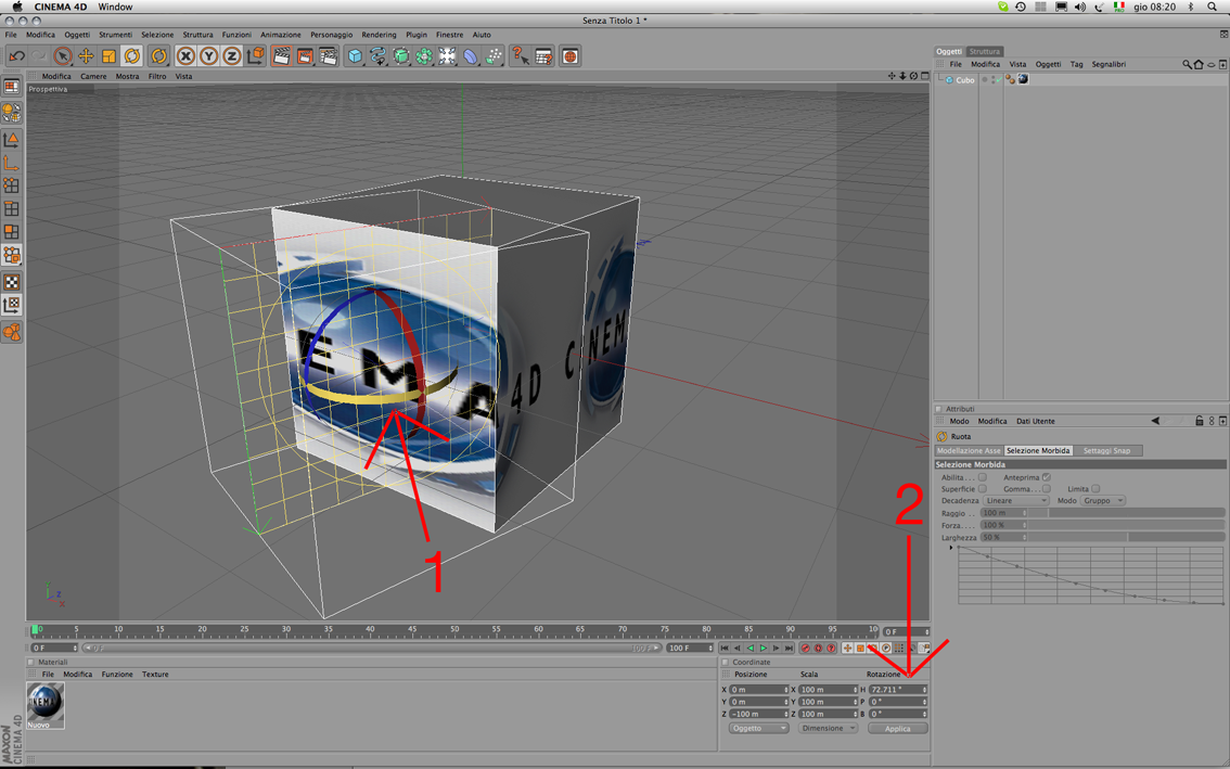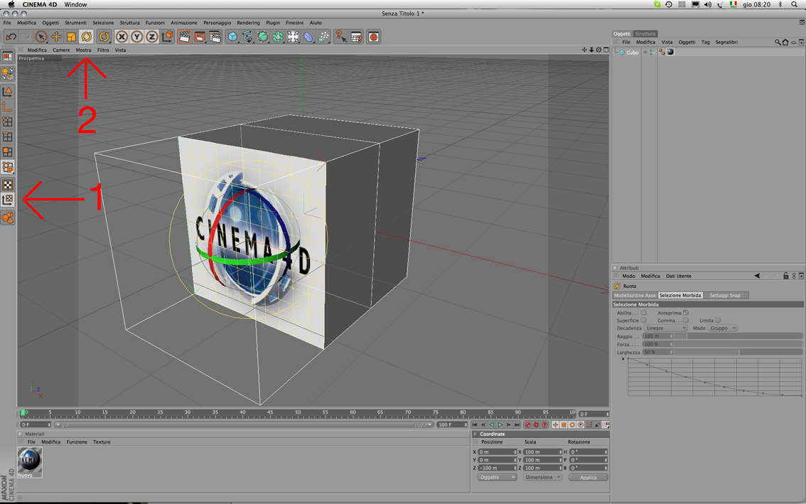 PRIMA SELEZIONI LA MODALITA' "STRUMENTO ASSE TEXTURE" (1) E POI VAI AD EVOCARE LO STRUMENTO "RUOTA" (2)