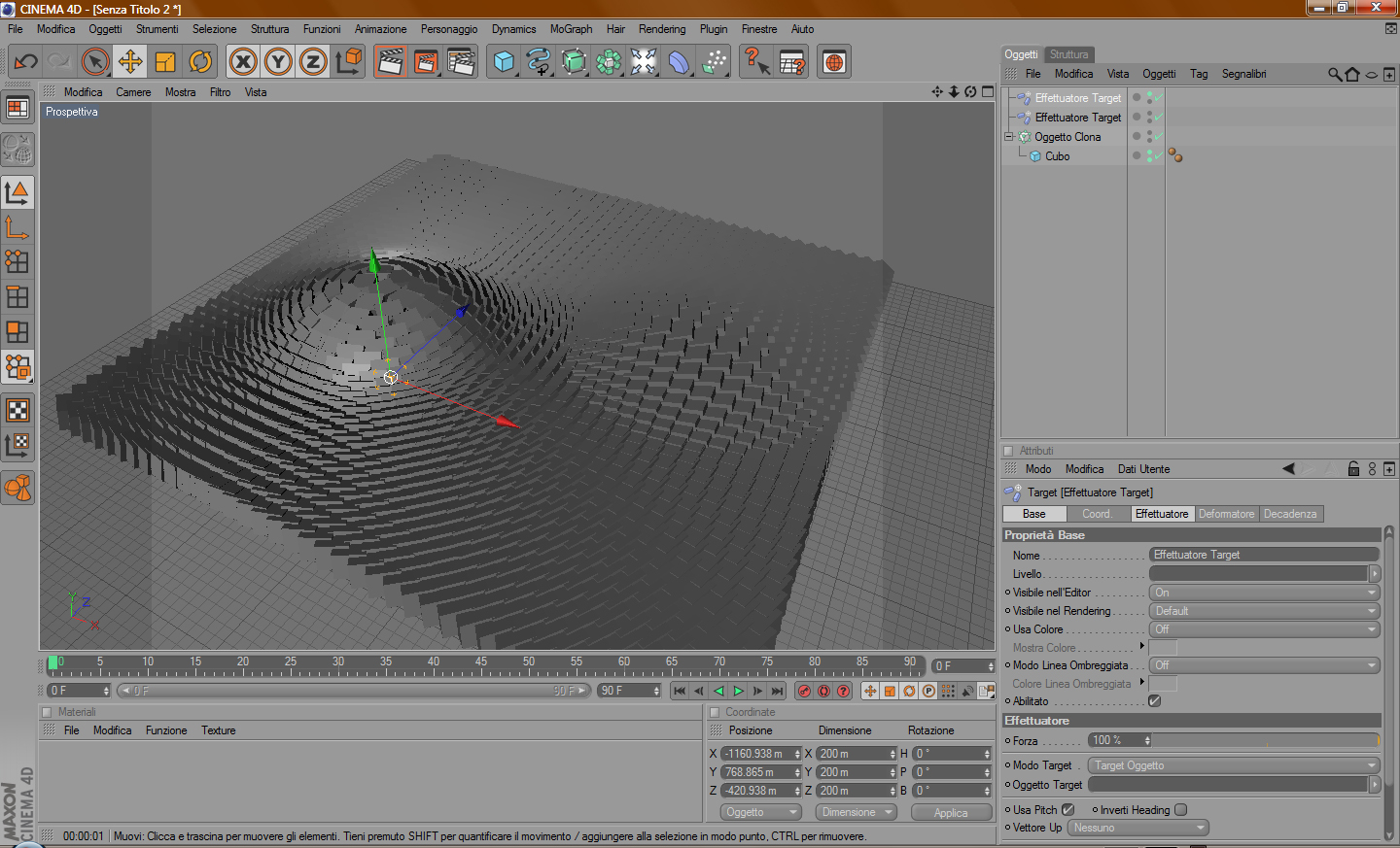 Come vedete dalle immagini....in Mograph sono riuscito ad ottenere questo risultato....ovvero creare un "piano" di cubetti e deformarlo con 2 effettuatori....