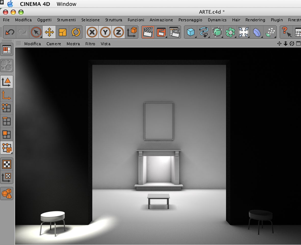 3) luce spot (visibile) giallina che punta sullo sgabello con intensità 140% che proietta un ombra area al 91%.