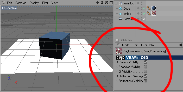 - metti il piano che riceverà le ombre e gli assegni il vrayCompositing tag