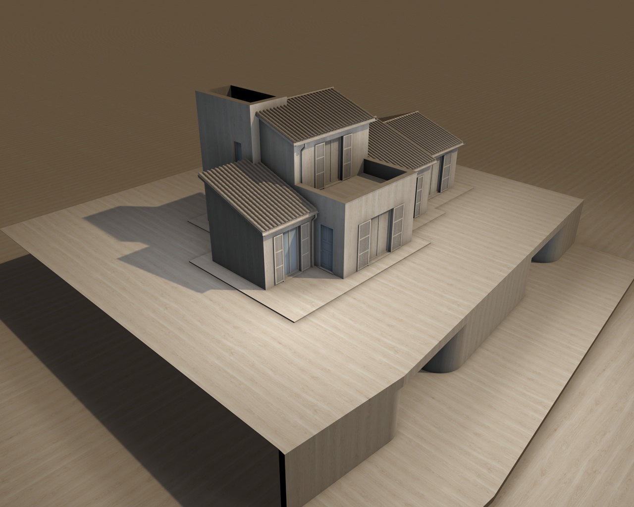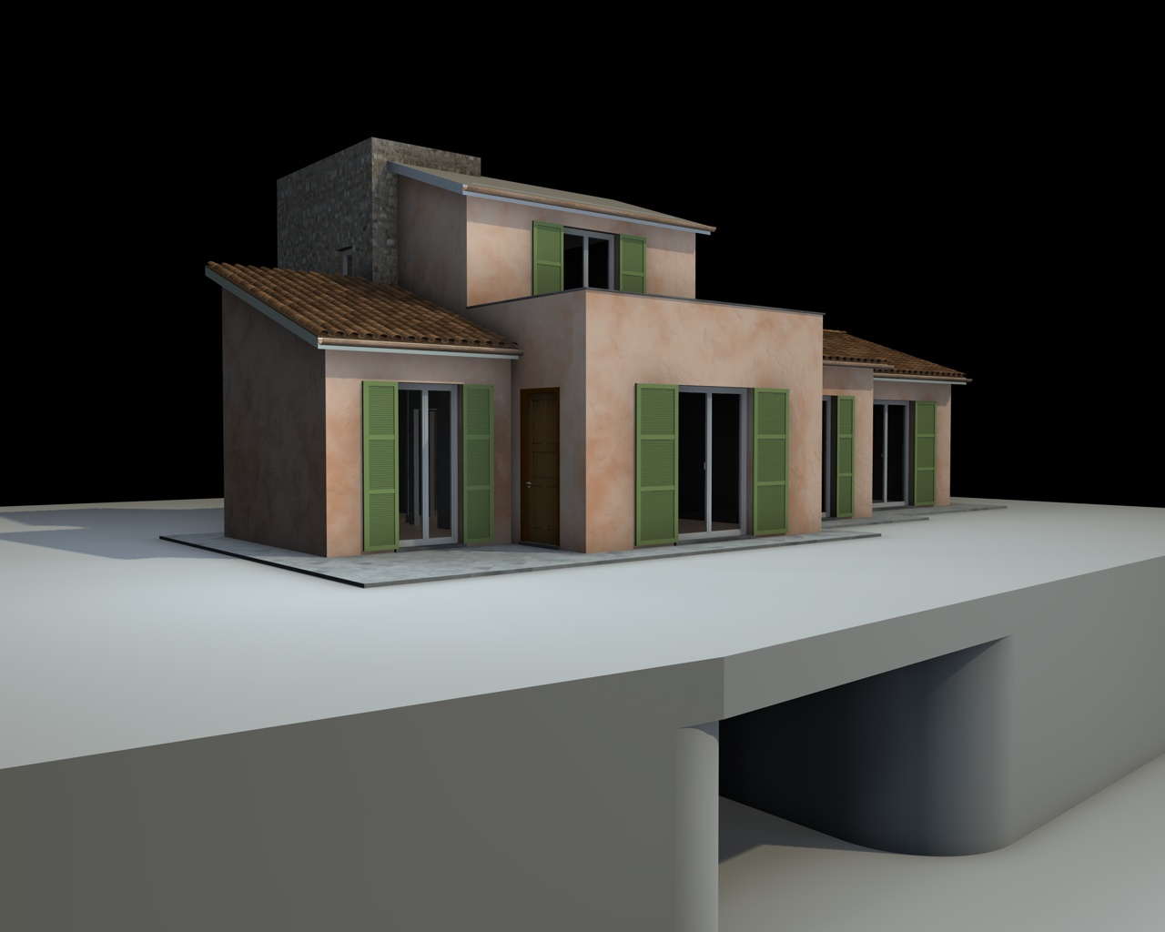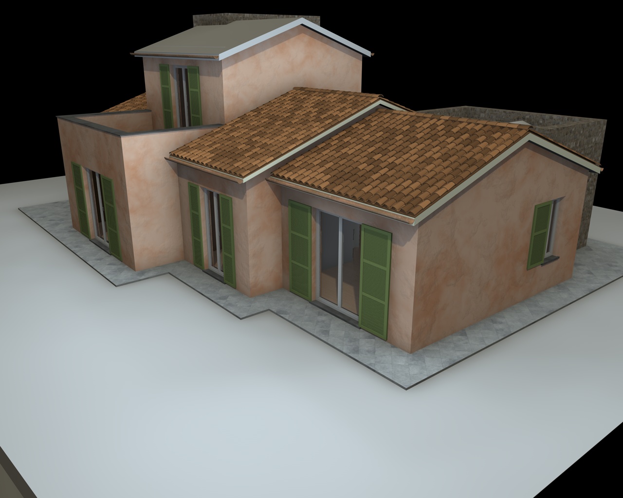 il tutto è ancora incompleto (mancano persiane, pluviali, cornici, coperture, rivestimenti etc etc) ed anche l'illuminazione non è ancora stata studiata: una luce infinita con ombre area ed una luce area-emisfero che mi illumina a 360 le parti in ombra