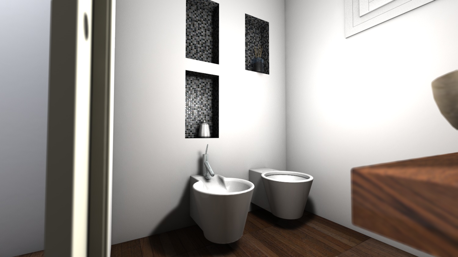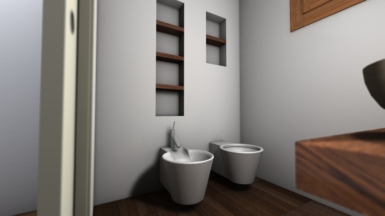 nuovo step. ho acceso gli spot e modellato meglio il lavabo (il bordo superiore stondato) e abbassato la luce dell'antibagno che era troppo forte.