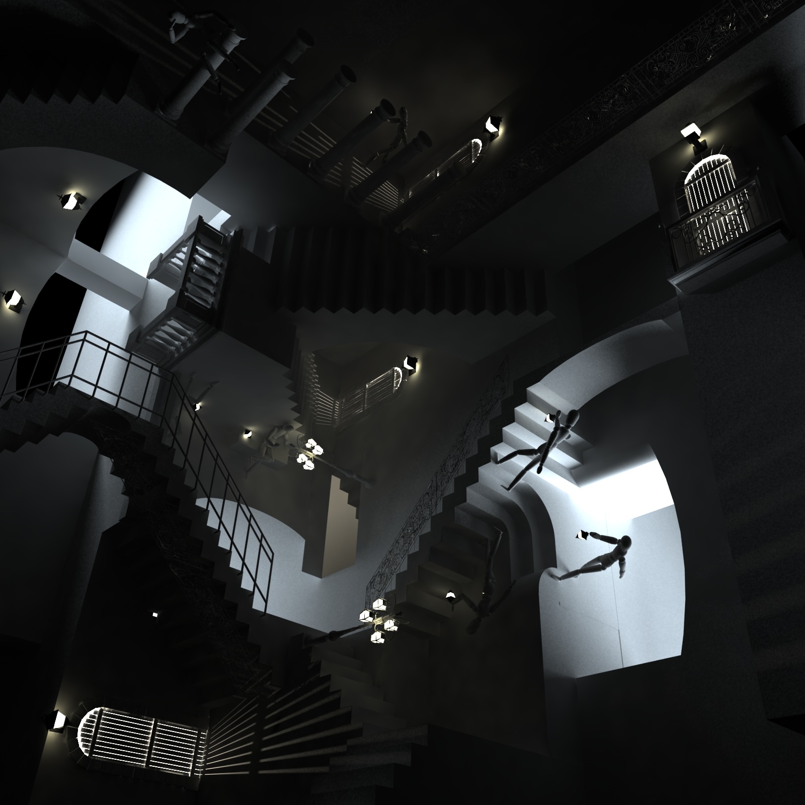 io per adesso vi posto una modellazione non finita e due o tre luci giusto x vedere l'atmosfera... poi io volevo mettere anche un po di edera (IVY) per accentuare ulteriormente le differenti "gravità" . per l'illuminazione mi piacerebbe averne 3 come 3 sono i punti di fuga, ma diventa difficoltoso e per adesso cmk non ci penso.