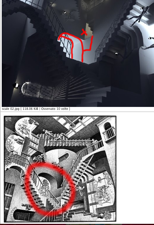 è un paio di giorni che sto modellando le scale in questione e ho dovuto "arrangiare" certe cose che il signor Escher nella sua bravura aveva un po sottovalutato. se osate criticarle :x .. niente fate pure!!! :)