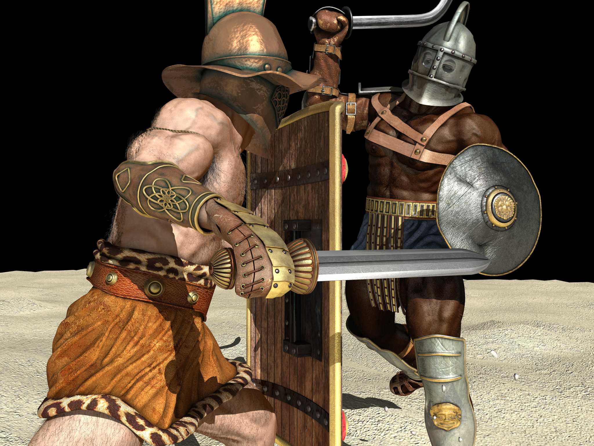 Un grossissimo scoglio adesso al di la del numero di marmi o dello sporco è rendere realisticamente la pelle. La quasi totalità delle immagini di alta qualità grafica che ho visto su cgtalk o sui più grossi siti internazionali concernenti figure umane o umanoidi riguarda soggetti singoli, illuminati sapientemente in modo da esaltare la translucenza della pella che è quella che poi alla fine fa la differenza, vale a dire lateralmente e da dietro e con sfondi generalmente scuri. Spesso si esalta il tutto con primissimi piani in cui viene valorizzato il lavoro in zbrush piuttosto che quello in body paint. Quà invece per ovvi motivi non è possibile ricorrere a trucchetti.
