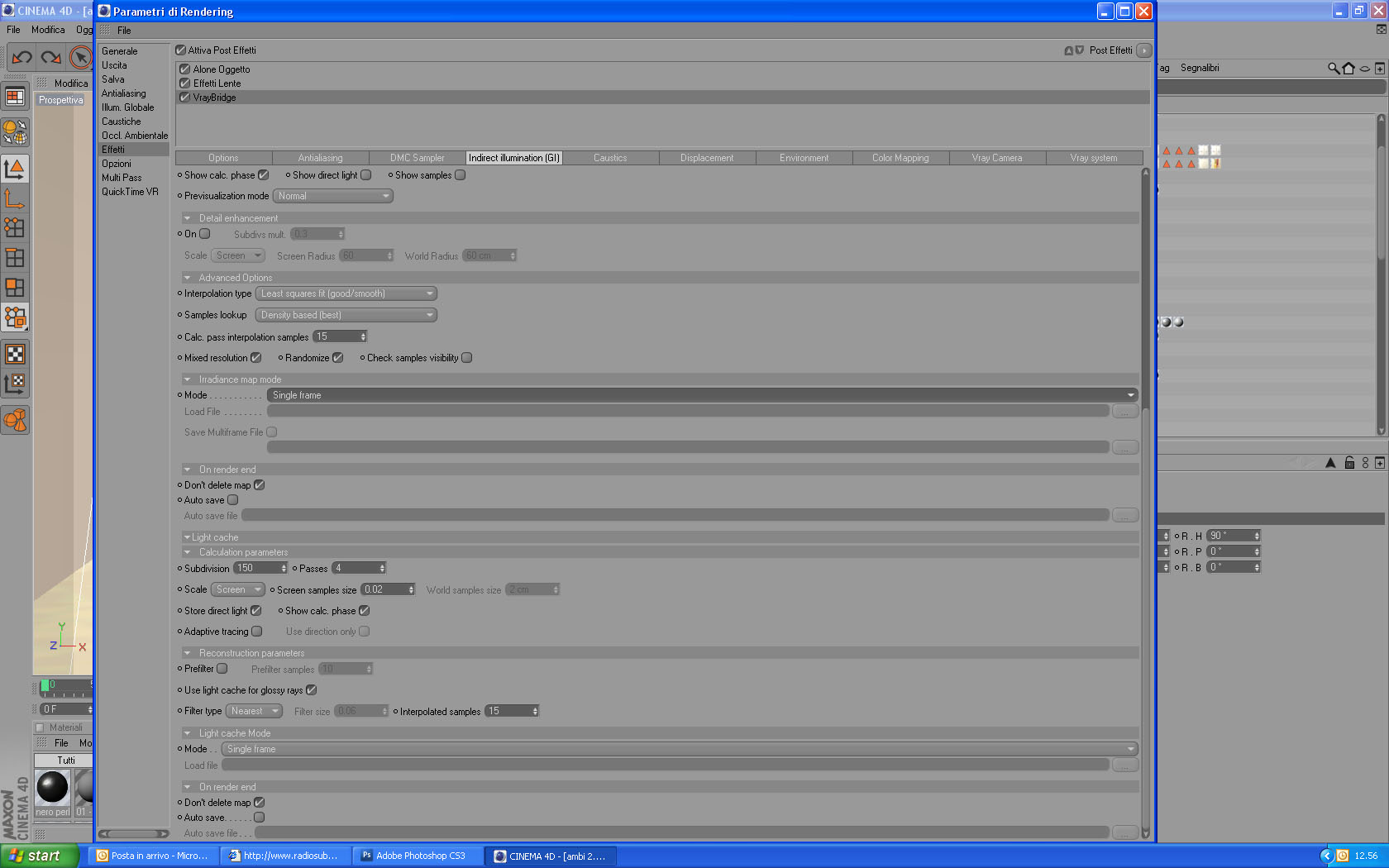 Aumenta la Light Cache, Subdivision: 700 oppure 1000; il numero di Passes dovresti settarlo in base ai core del tuo computer, se hai un dual core metti 2, se hai un quad core allora va bene 4.