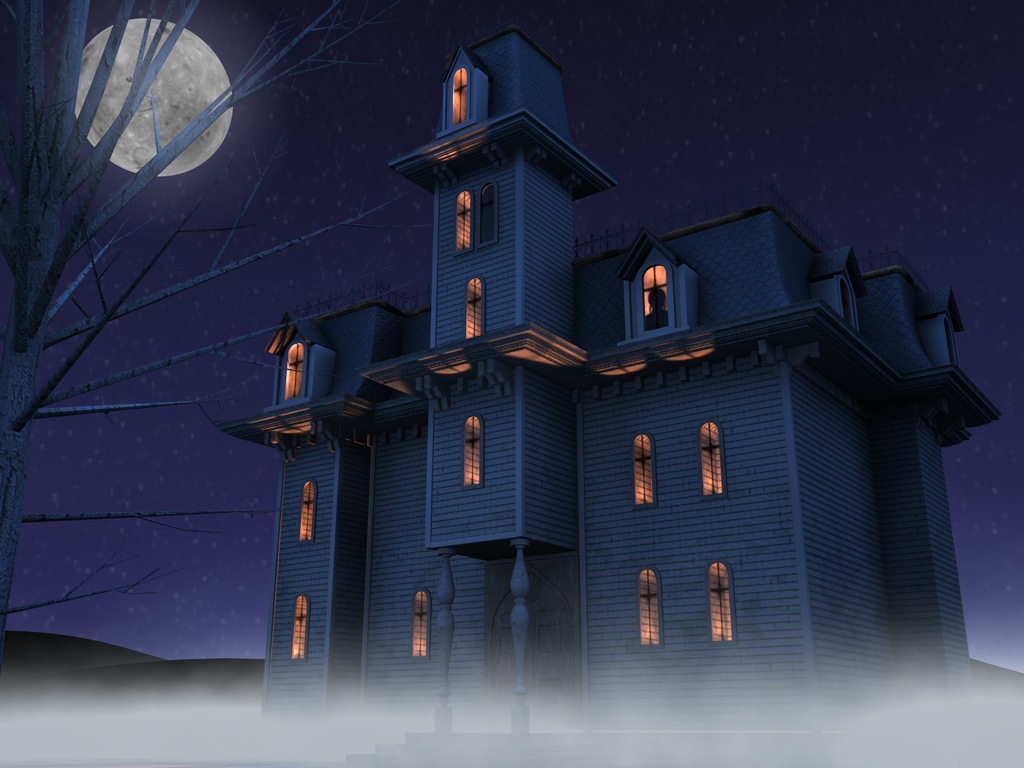 Consiglierei innanzitutto di inserire qualcosa dietro le finestre, ad esempio delle tende, disposte asimmetricamente per non dare l'idea del tutto preciso... inoltre per dare un'aria più minacciosa, inizierei inserendo un cielo con grosse nubi grigie anzichè il cielo stellato, e poi "rovinerei" la struttura stessa della casa... ad esempio aggiungerei delle crepe e dei rattoppi sulle pareti