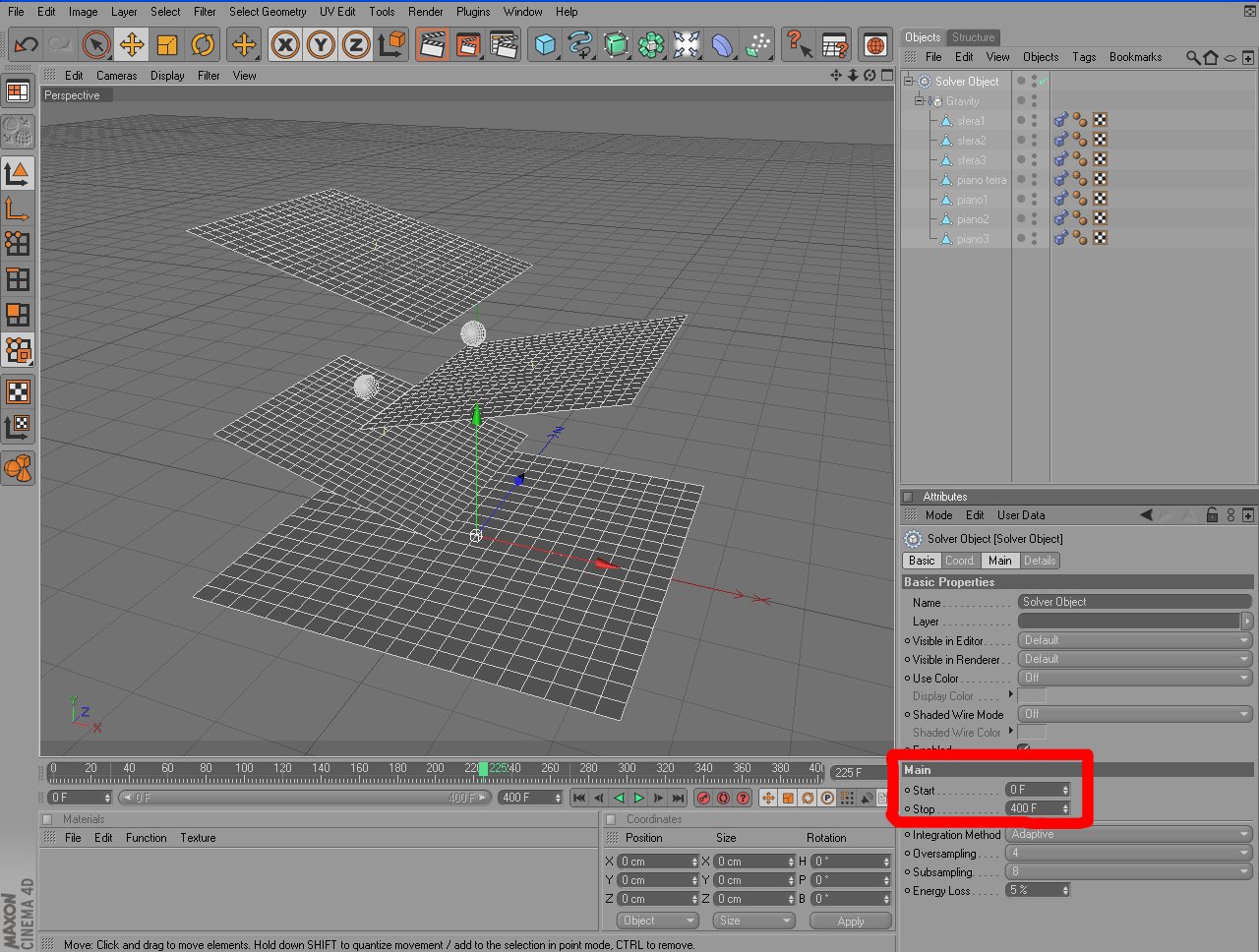 Ciao a tutti, sono nuovo a c4d e stavo tentando una semplicissima animazione per prendere confidenza con dynamics (tre sfere che cadono su piani inclinati). Ho impostato le preferenze per un'animazione fino a 400F. Qualcuno sa dirmi perchè l'animazione si ferma? Grazie a tutti in anticipo