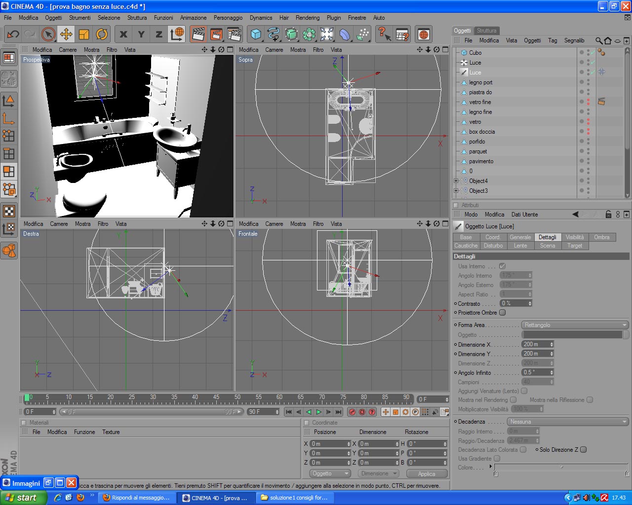 congelato il materiale vetro della finestra e inserita una luce area al centro della finestra con parametri: colore 255,255,255 intensità 100% ombra raytrace netta....se metto ombra area devo alzare tipo al 1000% l'intensità giusto?