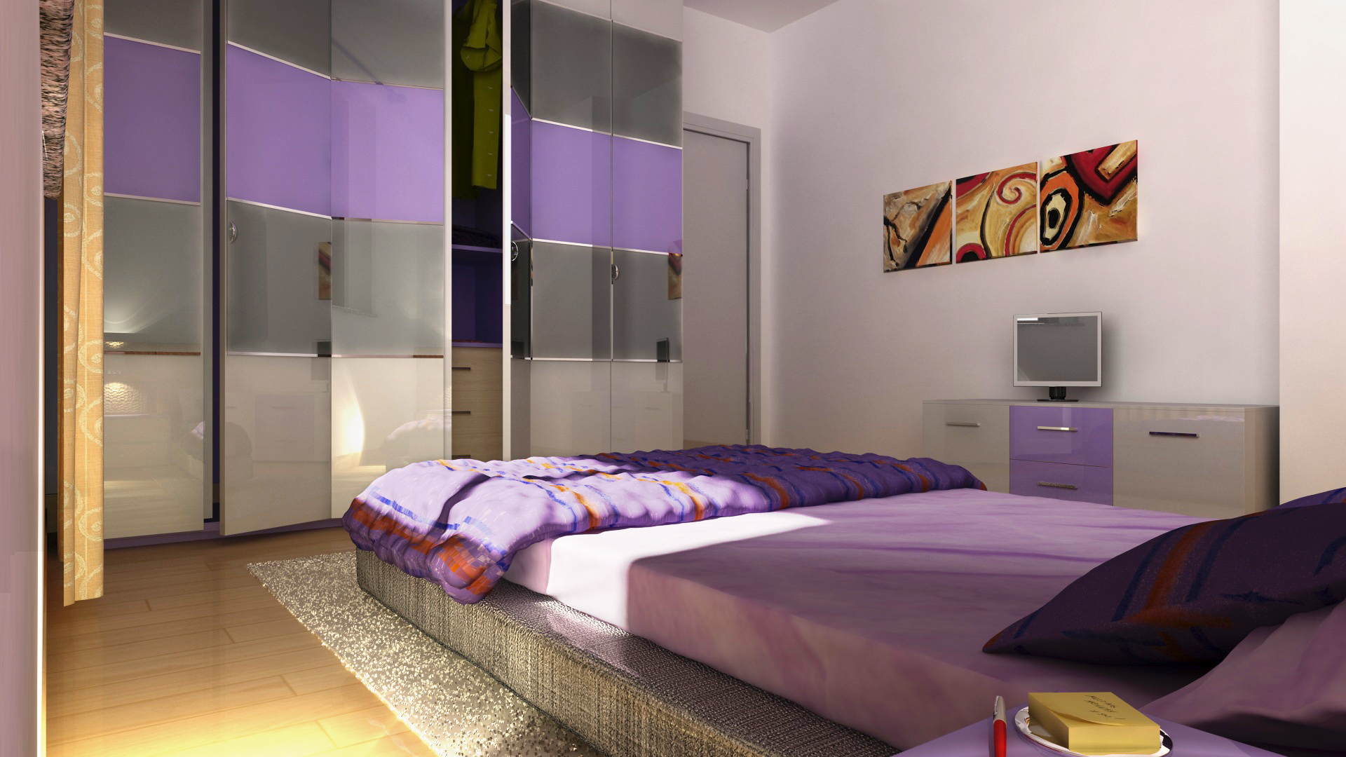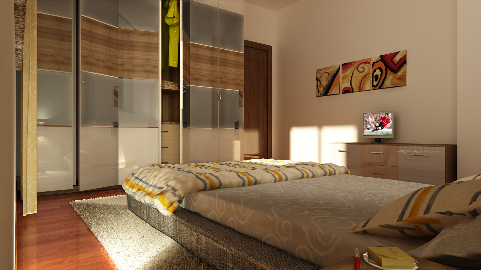 ci sono alcune texture da rimappare, ad esempio il legno nello stipite alto della porta, nella base dell'armadio, nel ripiano interno e forse anche quella dove poggia la tv... parere personale la tv la lascerei spenta, così sa di "montata" in post, ed aggiungerei un filo che da quel tocco di realismo in più...la "stropicciatura" della coperta mi sembra un po' troppo regolare, potresti porvare ad inserire solo nel bump diversi livelli di texture prese anche da CGtex, dei tessuti stropicciati...io spesso faccio così... dato l'inquadratura, sempre secondo me, nn ci sarebbe stato male il DOF, con il quale magari ti toglieresti anche "l'impiccio" dell'attaccatura della federa del cucino che mi sembra un po' spigolosa