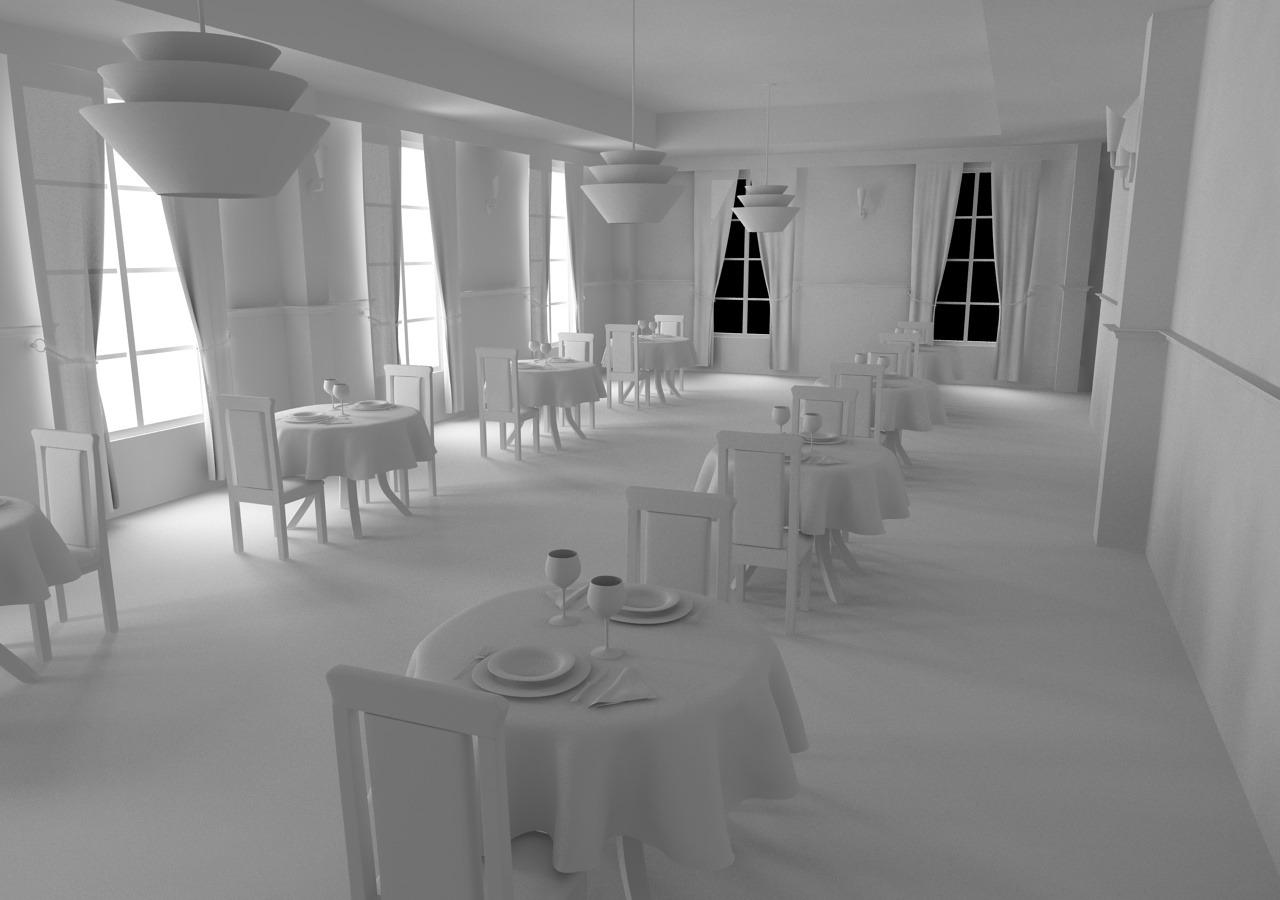 eccomi qua,allora...i modelli che vedete di piante li ho presi in rete...di questo rendering mi piace molto la resa di alcuni materiali come i tessuti,mentre ho sbagliato il bianco delle lampade...non capisco perche siano uscite cosi le tende frontali,con tutti quei puntini bianchi ecc...come avrete notato ho aggiunto anche il tv insieme ai menu sui tavoli,e che non ho duplicato in serie,ma li ho messi tutti in posizioni diverse e non sono in tutti i tavoli...poi ho anche notato che l immagine rimane ancora un po troppo rossa,forse dall eccessiva riflessione della carta da parati,e ho visto che cambiando da photoshop il bilanciamento colore del rosso,portandolo al cyan(il colore opposto)l immagine migliora abbastanza,proprio da li ho notato che e troppo rossa...se non correggo con la riflessione della carta da parati,credo che dovrò modificare il white balance