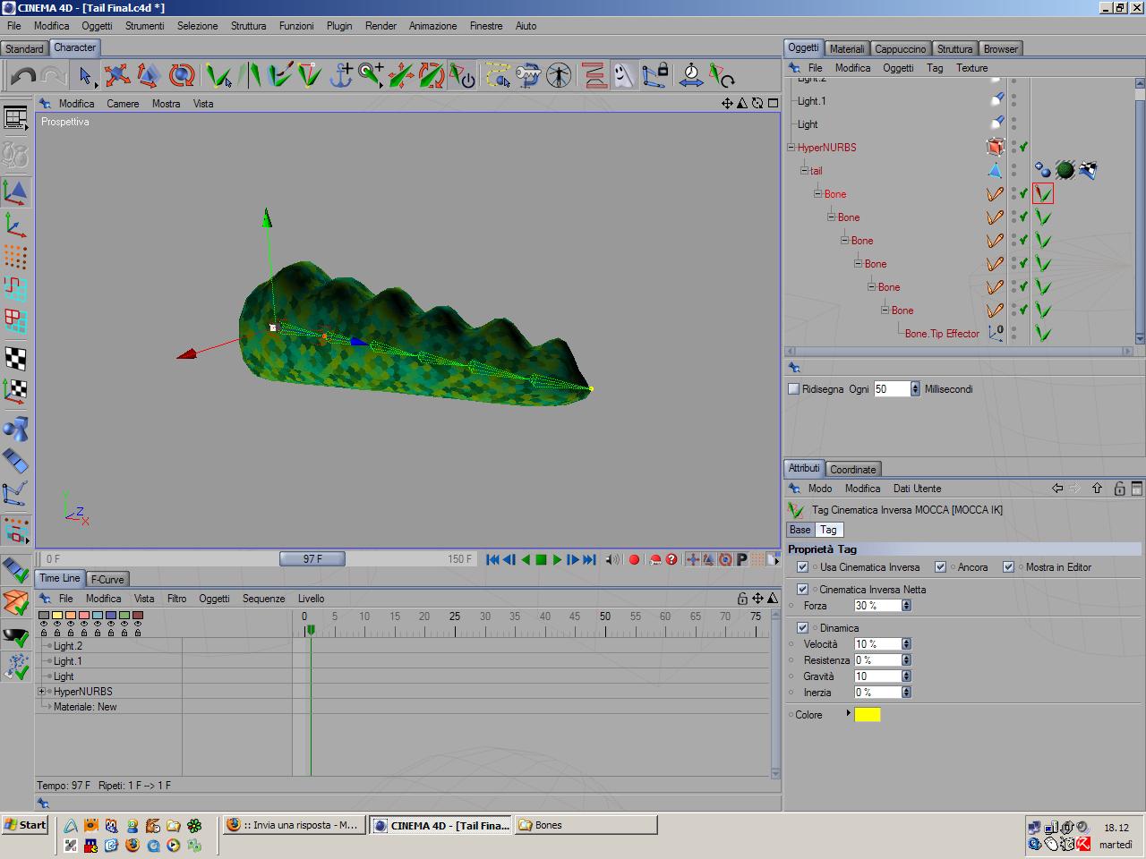 Il problema sorge quando al tag MOCCA IK applicato alla prima Bone (ancora), spunto la casellina "Dynamics".. in teoria il resto delle bone dovrebbe sottostare alla legge di gravità.. ma non accade nulla.. la coda resta perfettamente diritta.