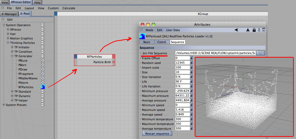 Aggiungo che si possono importare le sequenze .bin di RF dentro cinema tramite xpresso, per "trasformarle" in particelle di ThinkingParticles. I plug-in di interscambio con realflow aggiungono anche un nodo di Xpresso che permette di caricare le sequenze di particelle, in pratica aggiungi un nullo alla scena, gli applichi un tag Xpresso e nell'editor di xpresso aggiungi un nodo RFParticles; selezionando il nodo, dai suoi attributi, è possibile caricare la sequenza e anche variare alcuni parametri come la scala d'importazione ecc.