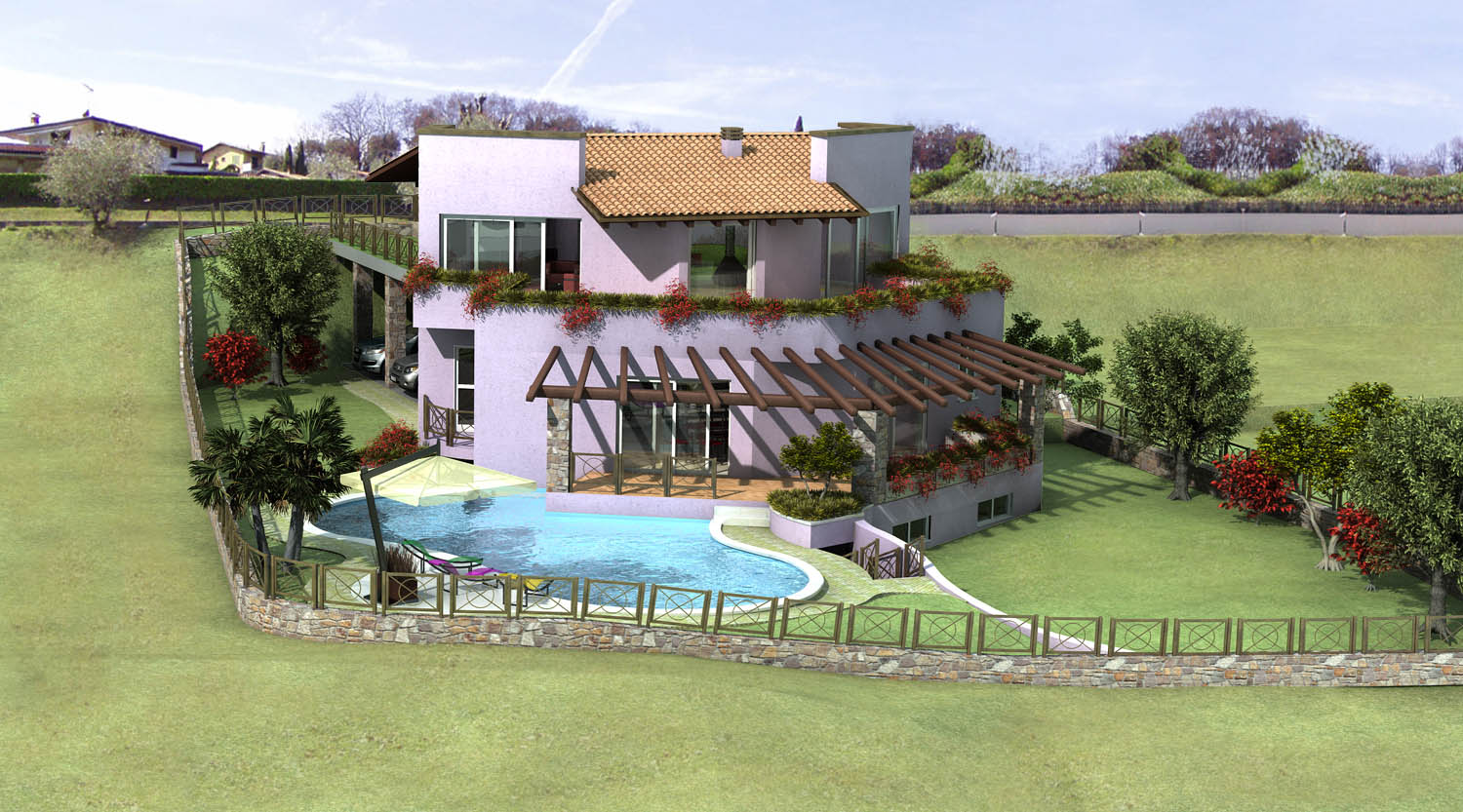 io ti consiglierei di o allargare il muro di cinta o di mettere un intorno più credibile cosi sembra un pò una prugna su un tavolo:)! poi forse il muro bianco dove è colpito dal sole non è un pò troppo luminoso?io farei l'intonaco esterno più opaco. Poi toglierei da dove lo hai messo l'ombrellone para sole, confonde la visione (anche perchè il suo bianco si confonde col bianco del muro) e non fa vedere bene l'attacco a terra della villetta, magari lo sposterei nel giardino a dx della piscina.