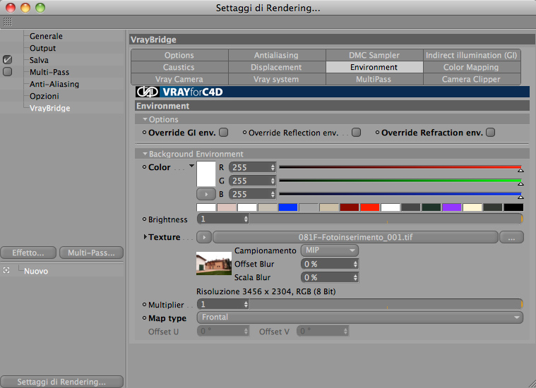 Ho riscontrato dei problemi con lo sfondo. Vray non mi renderizza l'Enviroment con caricata la foto di fondo utilizzando la VrayPhysicalCamera. Ho notato che invece lo sfondo viene renderizzato da Vary se utilizzo la camera standard di cinema 4D senza tag.
