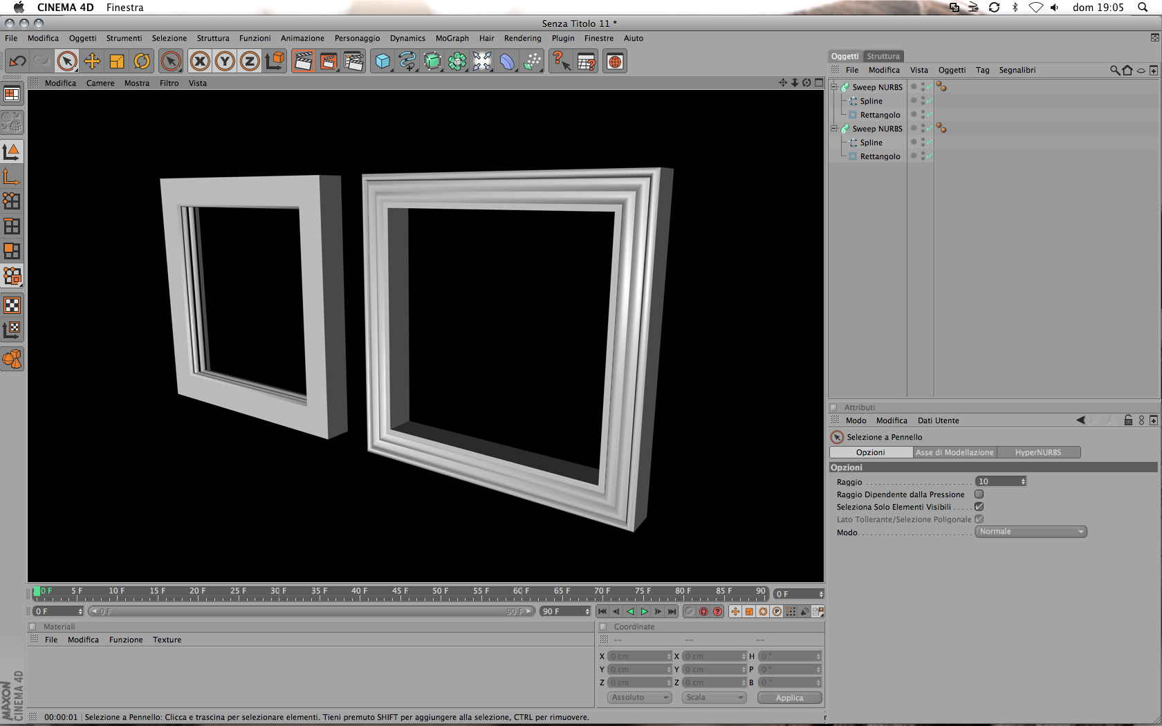 Allora io sto seguendo delle esercitazione date dal mio professore, e devo realizzare una scena di una camera interna. Ho un problema quando vado a creare la cornice di un quadro. In rete ho visto che la via piu' breve e': creare il profilo della cornice con una spline, poi inserire una spline rettangolo dargli le dimensioni del quadro, e infine inserire uno sweep nurbs in modo da far percorrere la spline profilo lungo tutto il rettangolo per creare la cornice.