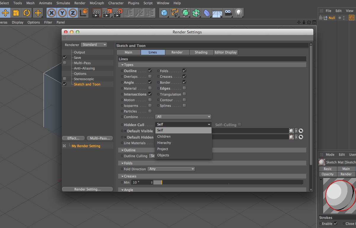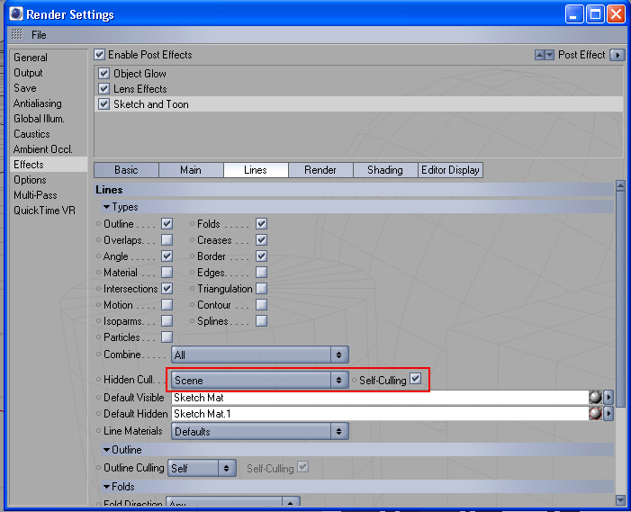 Se imposto l'opzione hidden cull su "self" si intendono per linee nascoste solo quelle retrostanti di ogni singolo oggetto ma non quelle che un oggetto in primo piano copre stando davanti a un altro oggetto, invece impostando hidden cull su "scene" diventano nascoste tutte le linee della scena che sono coperte da qualcosa (o da altre parti dello stesso oggetto o da altri oggetti)