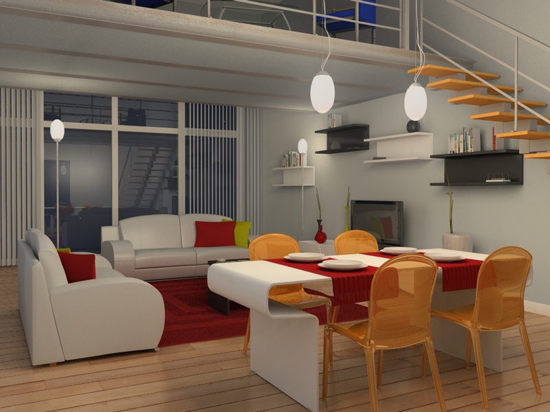 Poi il tavolo in primo piano secondo me non ci sta, non si può spostare portandolo un po fuori dalla scena anche ruotandolo di 90 gradi. Cambierei il materiale alla sedia sul soppalco.