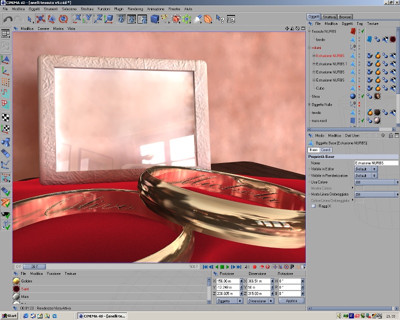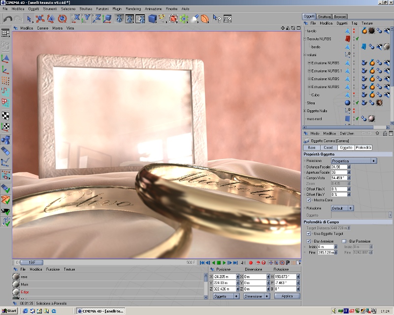 Per realizzare questo effetto, dopo aver per bene disposto il piano, il tavolo e gli anelli, ho lanciato l'animazione, il tessuto ha cominciato così a deformarsi sotto la spinta del vento e delle altre forze, quando mi pareva di vedere un buon frame, lo fermazio e renderizzavo. Ammazza che casino comunque, a parte l'dri che ogni volta impiega 2 minuti, poi alle volte si instauravano degli errori e i cirpi compenetravano e così via...