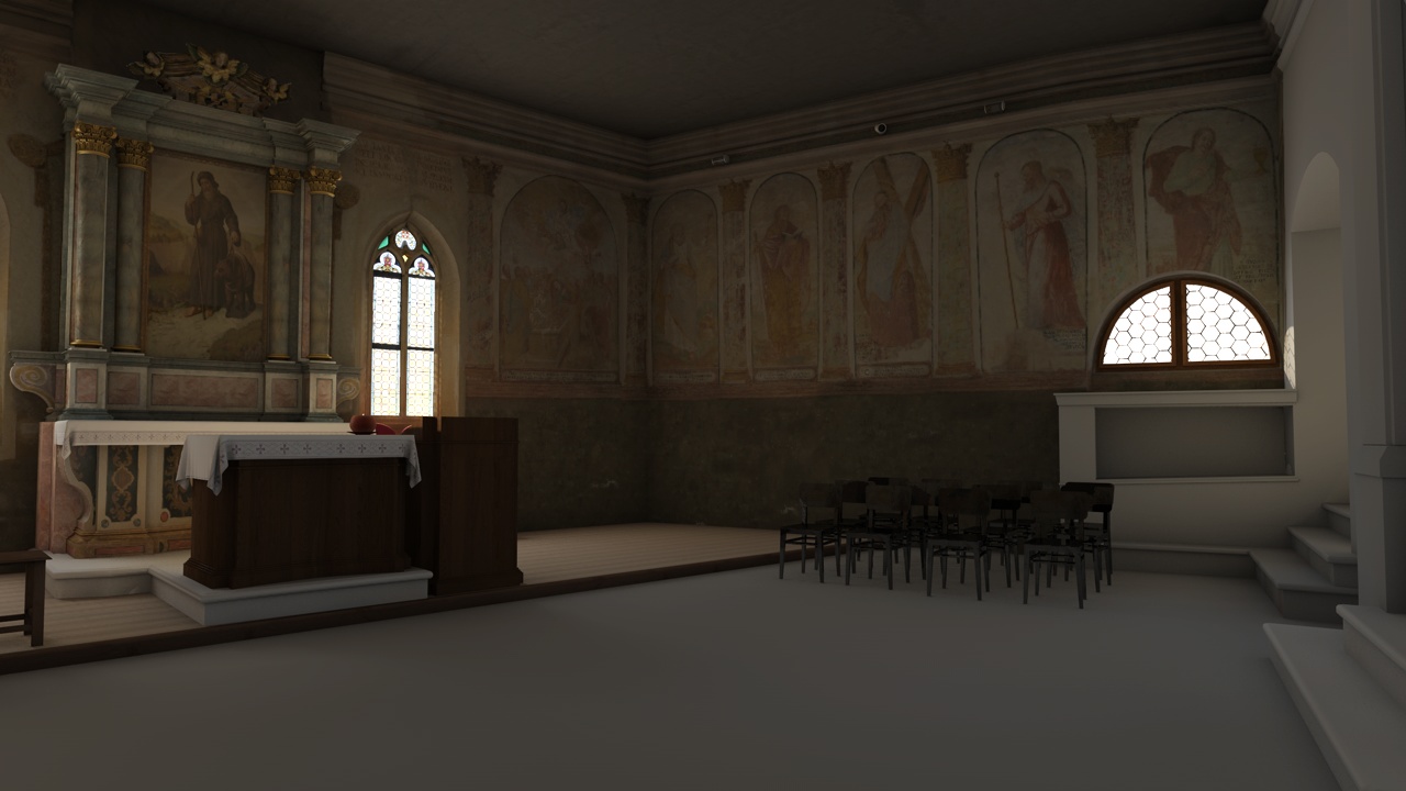 Proverei comunque a disporre le luci diversamente..non so' se è così il modello originario, ma così dà un abbagliamento un po' fastidioso. Punterei su luci poco intense indirette, verso l'alto, con spot a definire le parti significative (affreschi, dorature..). Qualche dettaglio a luce radente (sarebbe bello leggere la grana pastosa degli affreschi o la specularità nuvolata tipica degli stucchi).