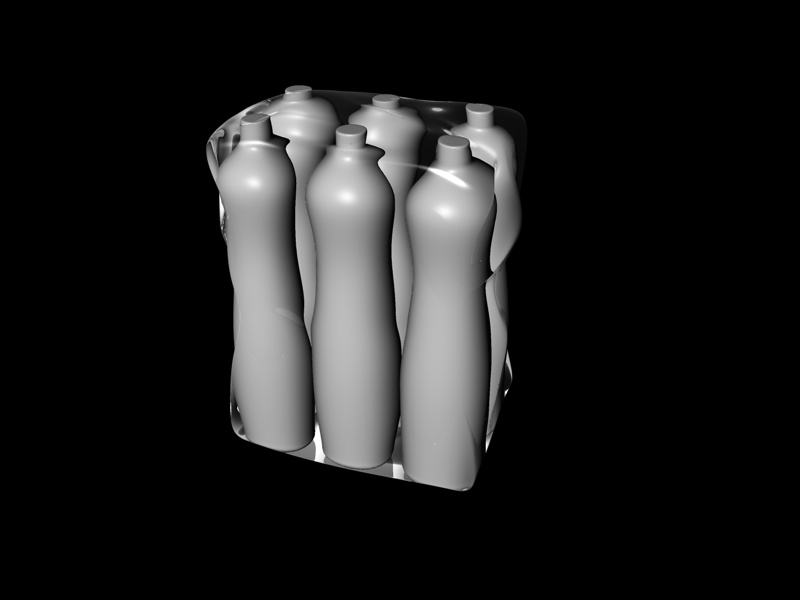 poi metti i frame a 99999 (di modo che hai tempo per cambiare i parametri), e man mano che va l'animazione, aumenti (comando scala) le dimensioni delle bottiglie, di modo che il tessuto (cellophan) aderisca.