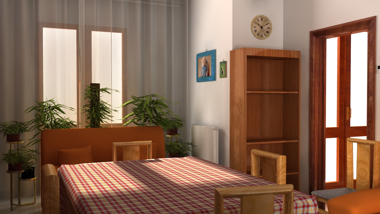 eccomi.. ho dato una ritoccata ad un po tutto cio che c'era nel file che mi hai spedito... c'erano parecchie cose che non andavano, le luci erano al contrario, oggetti che compenetravano i muri (vedi termosifone), i materiali avevano tutti impostazioni di specularita sbagliate ed anche le riflessioni non andavano... anche la tovaglia aveva la riflessione attivata :wink: , i legni ed i divani avevano colori troppo forti