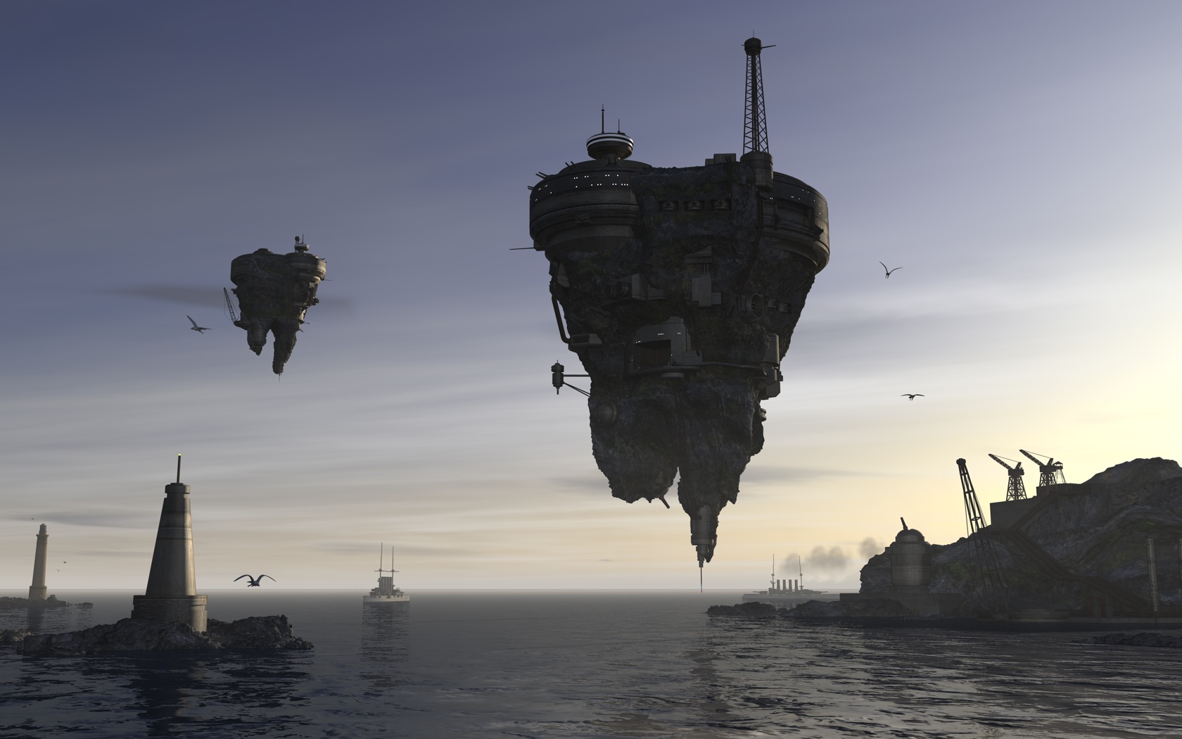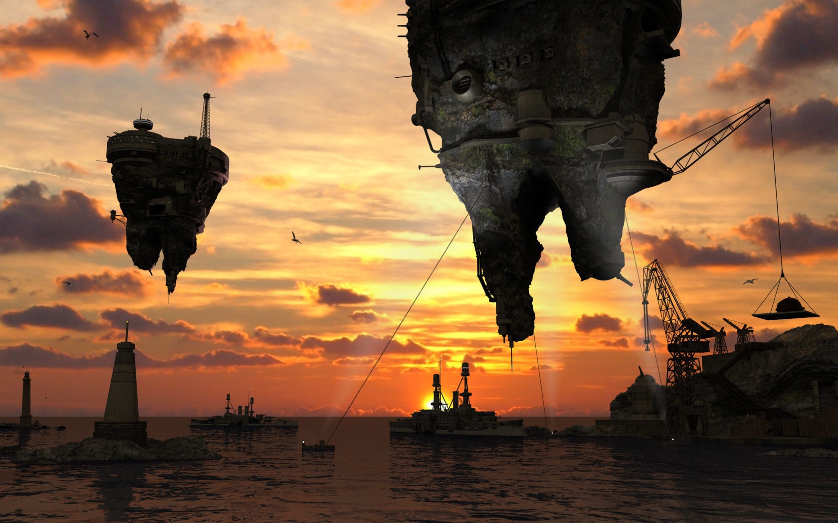 Bella scena: compliments.........L'unico appunto che mi sento di sottolineare è il tipo di inquadratura. La scelta del sole frontale porta inevitabilmente ad avere gli elementi della scena scuri: infatti le navi e il "sasso" di sinistra non si vedono, cioè non se ne vedono gli elementi. Buona l'illuminazione di quello destro. Prova ad inserire luci come hai fatto con quello anche sull'altro e sulle navi in modo da illuminarle o perlomeno che si intraveda qualcosa, altrimenti hai lavorato a modellarli per niente, visto che non si vedono solo le sagome..........