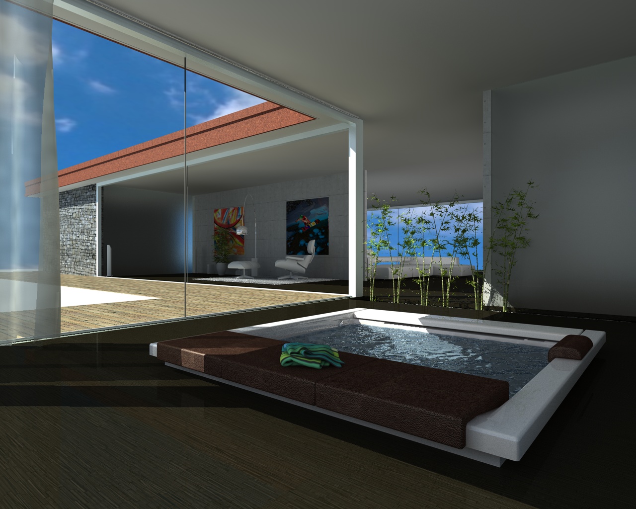 Inoltre ho cambiato lo sfondo (troppo sfocato), variata la scala della texture del pavimento (mi sembra che vada decisamente meglio), eliminata per ora la tenda. che ne dite?