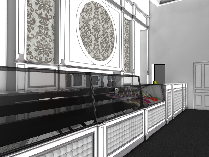 Proverei a schiarire i vetri, rivedere il mat. pavimento (riflessione? specularità?); il damascato sembra sgranato: se non hai un bitmap migliore prova a ridurlo di scala e magari copialo nel canale rilievo per dargli leggermente più corpo. Eviterei il bianco puro. Caratterizzerei meglio l'imbottitura del bancone (mat. pelle?).