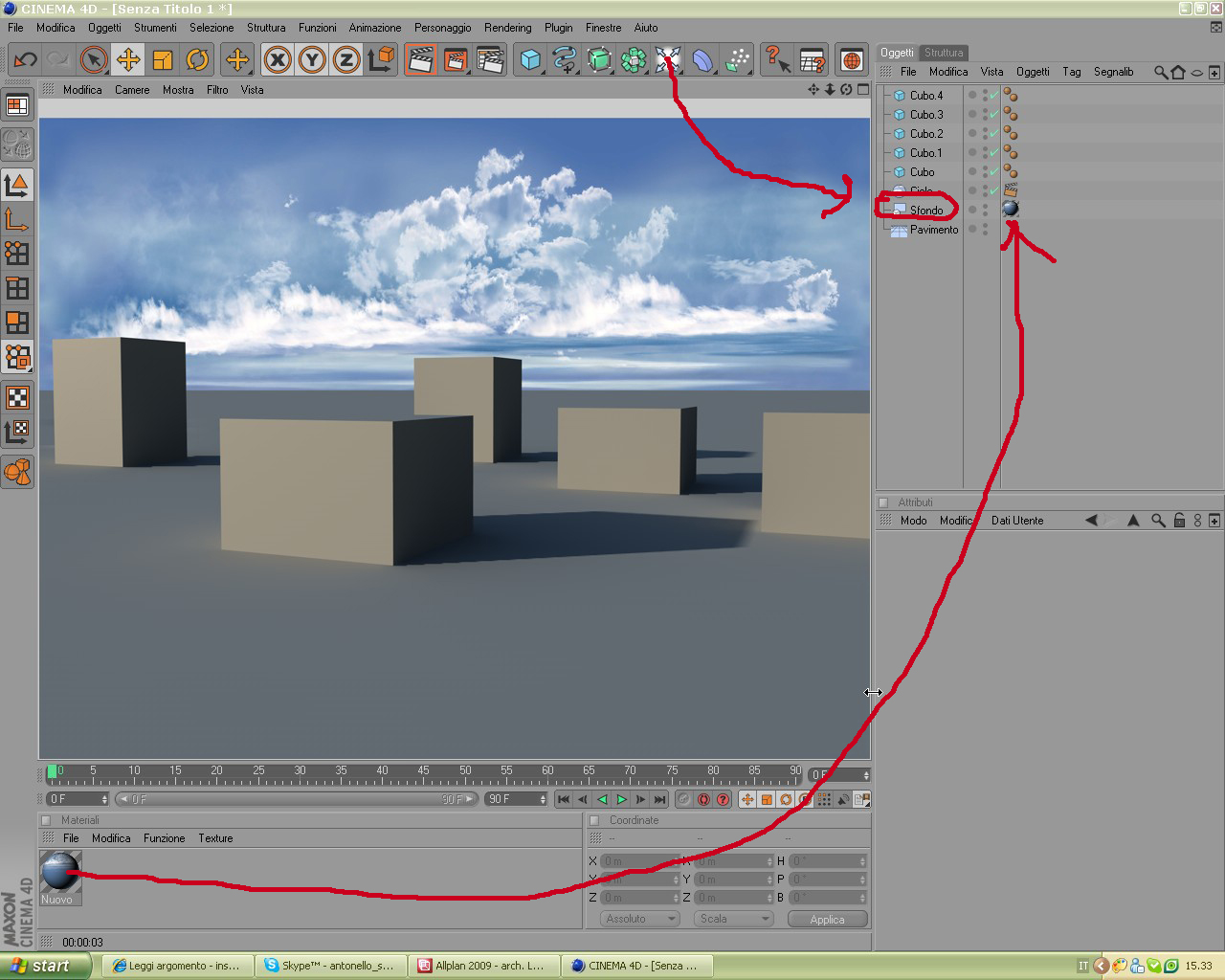 nuovo materiale dove nel canale colore inserisci una tua foto (in questo caso nuvole)
