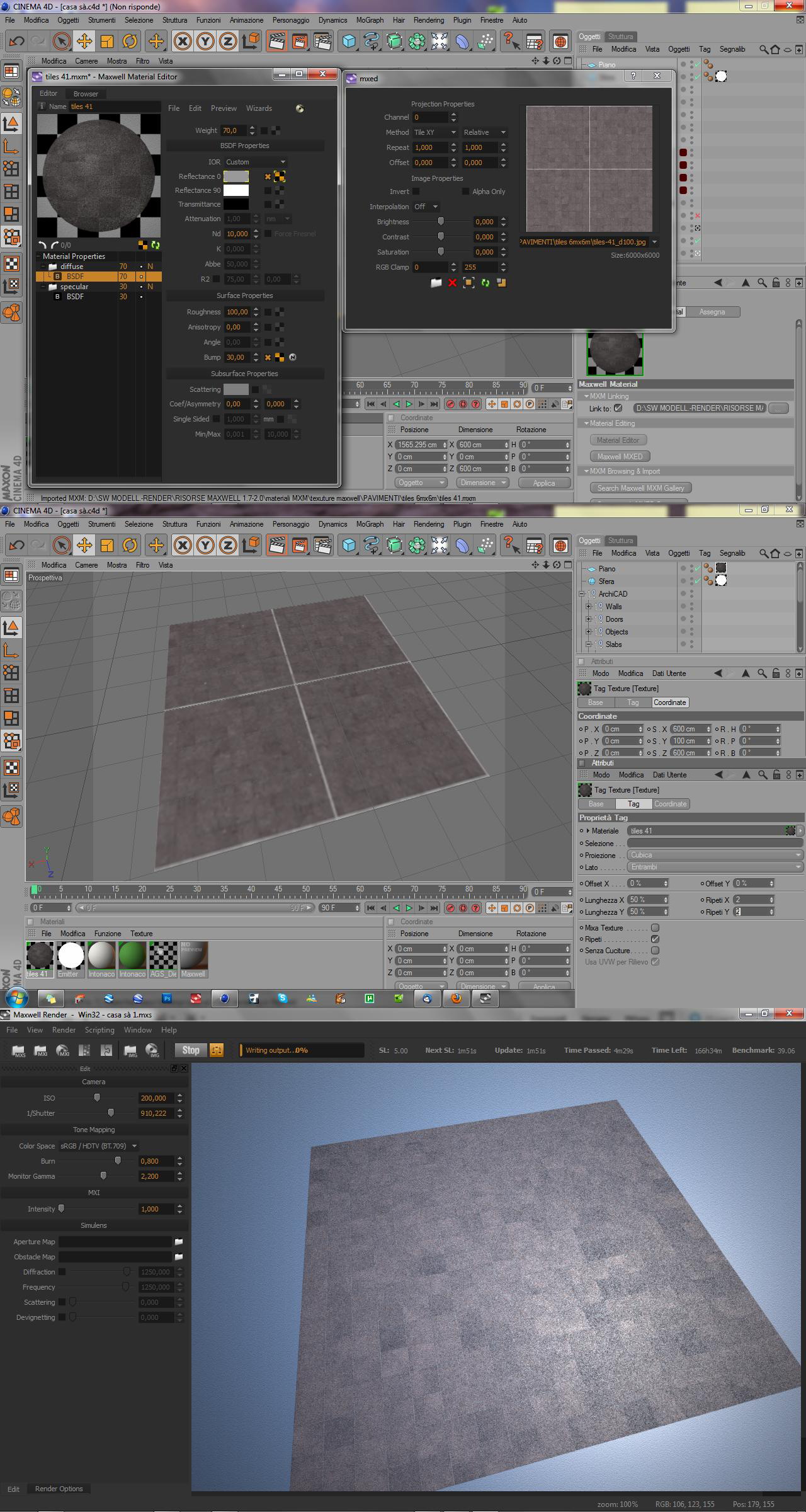 - nella seconda modifico i parametri "coordinate X e Y" e "ripeti X e Y". in questo modo, come si vede nel render sn giunto ad un corretto dimensionamento del materiale sul piano.