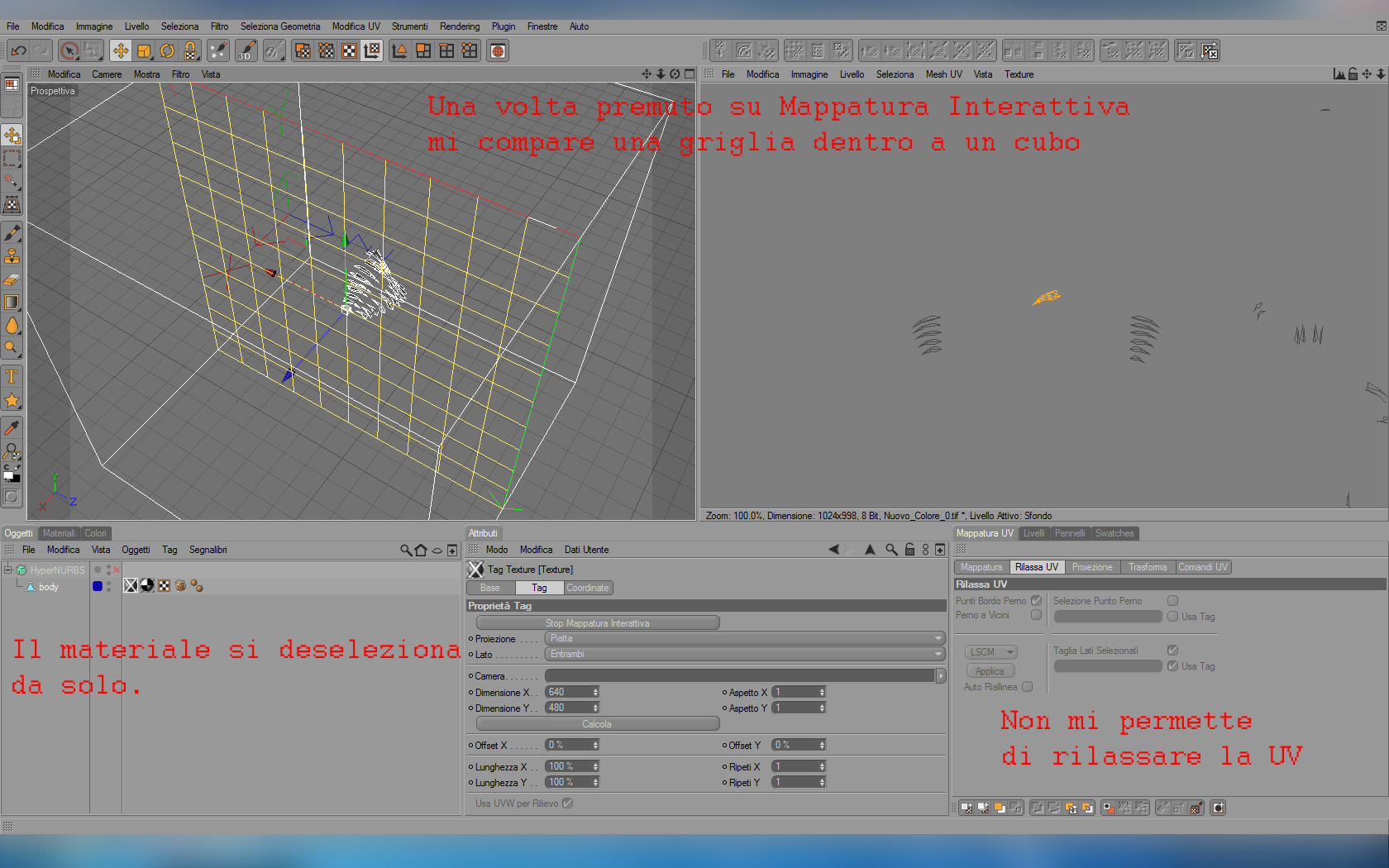 Ciao _Kino_ Ho seguito il tuo tutorial ma si vede che sono impedito forte perchè una volta cliccato su mappatura interattiva il materiale scacchiera creato si deseleziona da solo. Il comando rilassa UV rimane inattivo per cui non saprei come andare avanti...