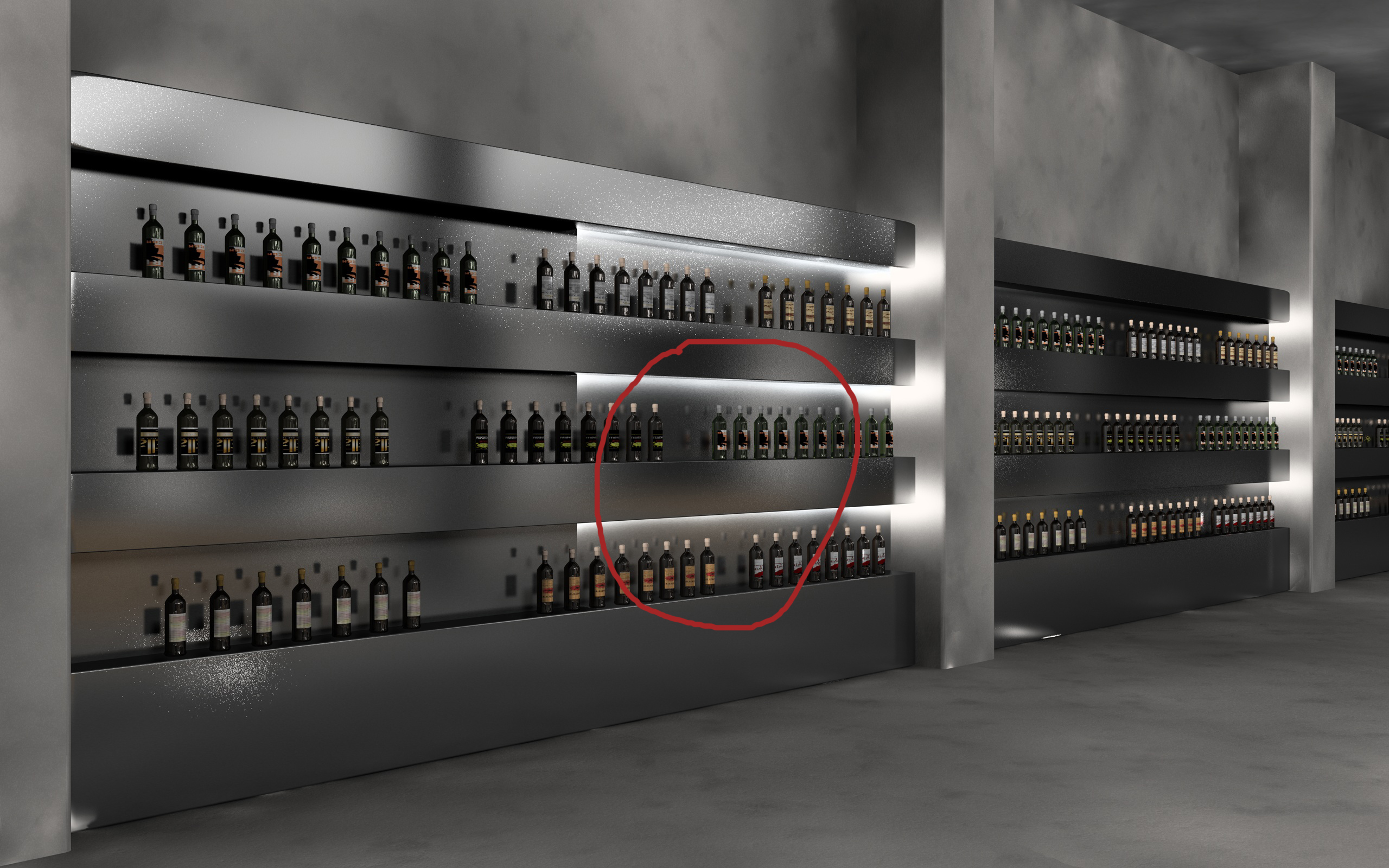 Bel lavoro, ma se posso permettermi.. le due bottiglie indicate dalla freccia a me sembrano non proporzionate in grandezza rispetto alle altre per cui io le ingrandirei un pò. Poi effettivamente come dici anche tu, le pareti non sembrano di cemento.. a me sembrano più di marmo. Cmq brava mi piacciono molto i tavoli (banchi? banconi? :)), hanno una bella linea.