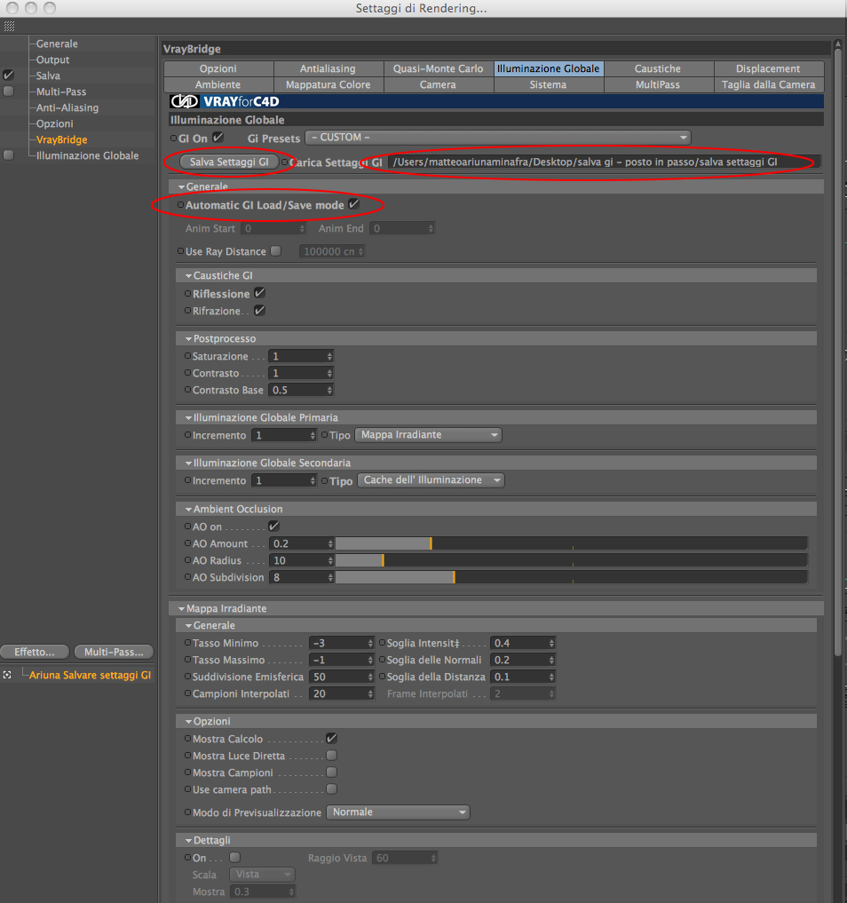 "Automatic GI load/save mode" spuntiamo la casella in modo che i settari di luce dell'immagine che stiamo renderizzando si salvino automaticamente nel percorso da noi sopra assegnato e vengano sfruttati successivamente per altri render (dello stesso file - della stessa prospettiva e nelle dovute proporzioni ) …..