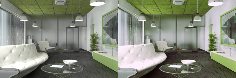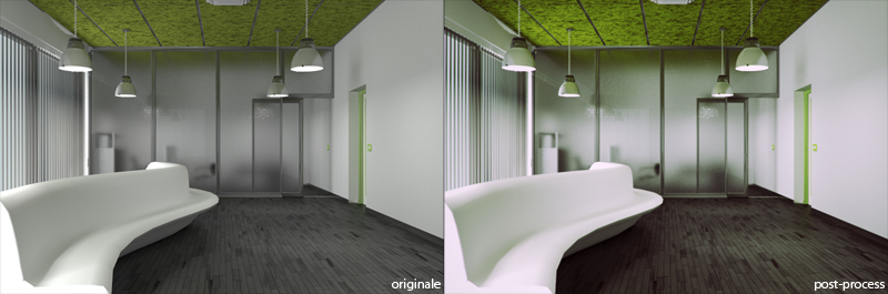 ho fatto le modifiche che mi avevate -giustamente- suggerito e sono arrivato ad una situazione di compromesso che mi va abbastanza bene, in più le altre modifiche principali per il momento sono la riconversione di tutto il sistema illuminotecnico/materiali al LWF e la modifica all'arredo, con il volume centrale occupato da divano, portariviste, e ammeniccoli vari [ancora in fase di modellazione, portate pazienza]. ho fatto anche un paio di prove di postprocessing di cui vi posto il risultato che mi soddisfa di più.