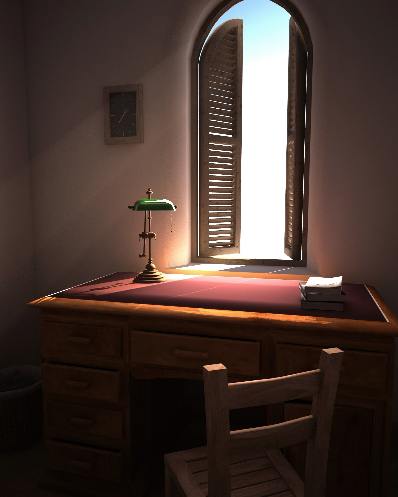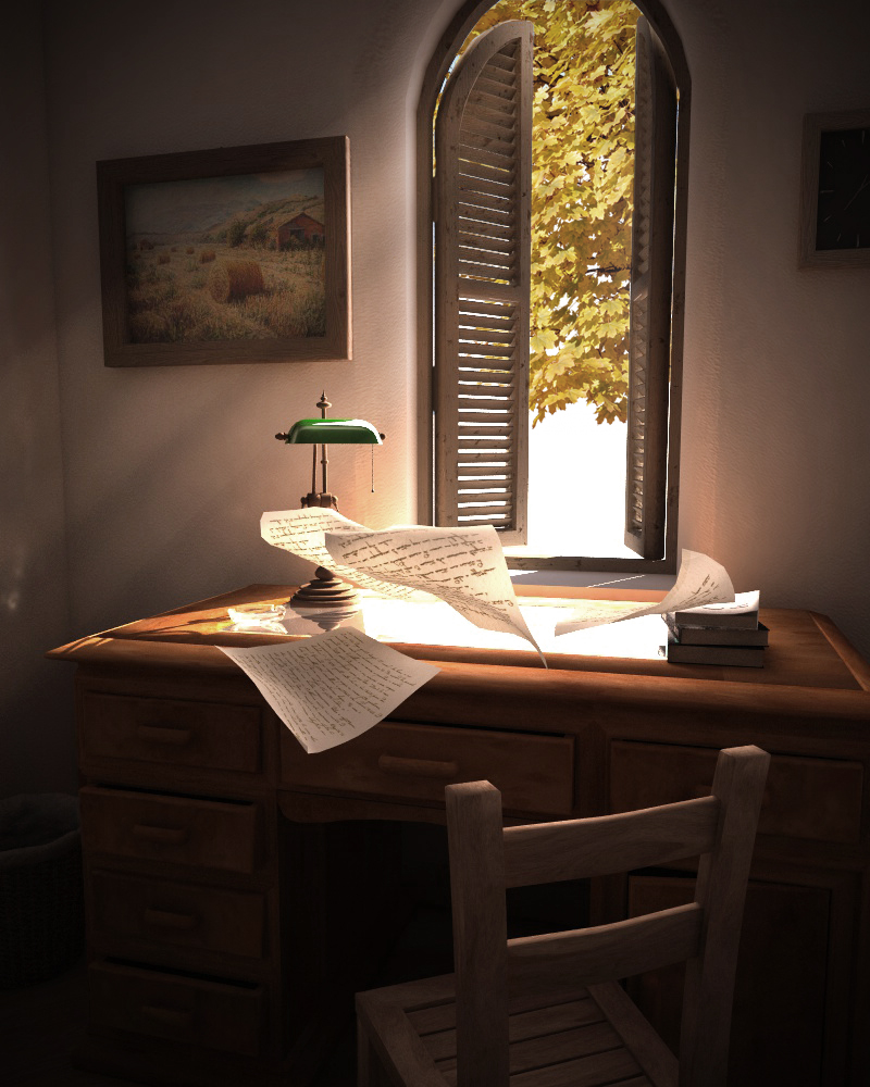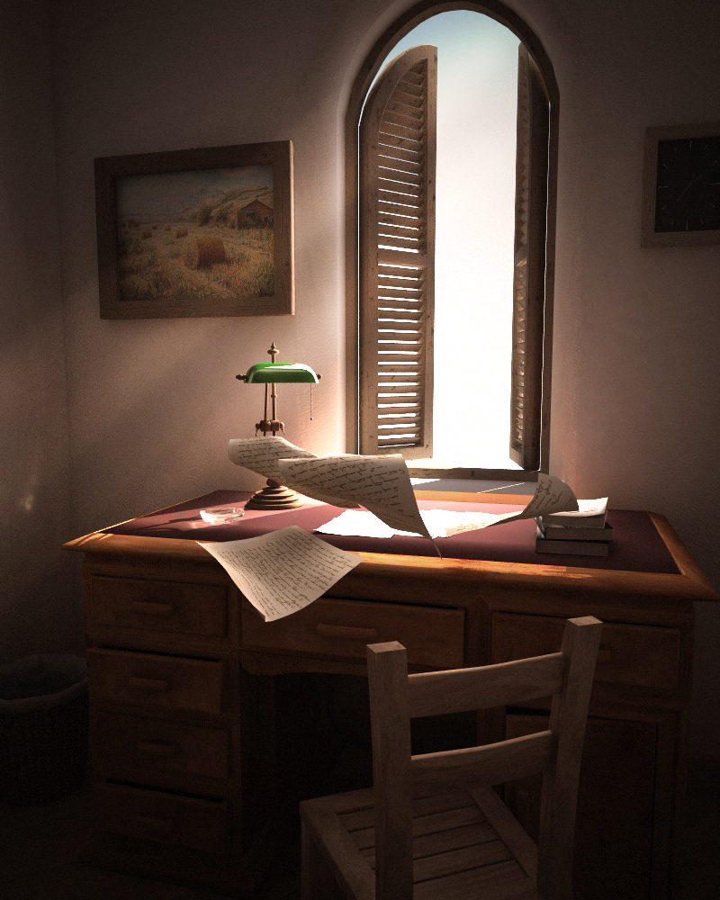 Complimenti l' immagine è veramente molto suggestiva!!! secondo me potresti mettergli uno sfondo alla finestra per renderla ancora meglio. gli spigoli sopra della sedia nono un pochino troppo vivi potresti dargli una smusssata volendo, e, ma questo è un parere personale, a me non fa proprio impazzire il materiale rosso della scrivania, dovrebbe essere tipo una tela? comuqnue a parte queste scioccchezzuole, è un immagine ottima!!! fantastiche le pagine che volano!!! non so se quel materiale (quello delle pagine) l' hai fatto con un 2side, in caso potresti provare, verrebbe sicuramente un effetto bellissimo!!