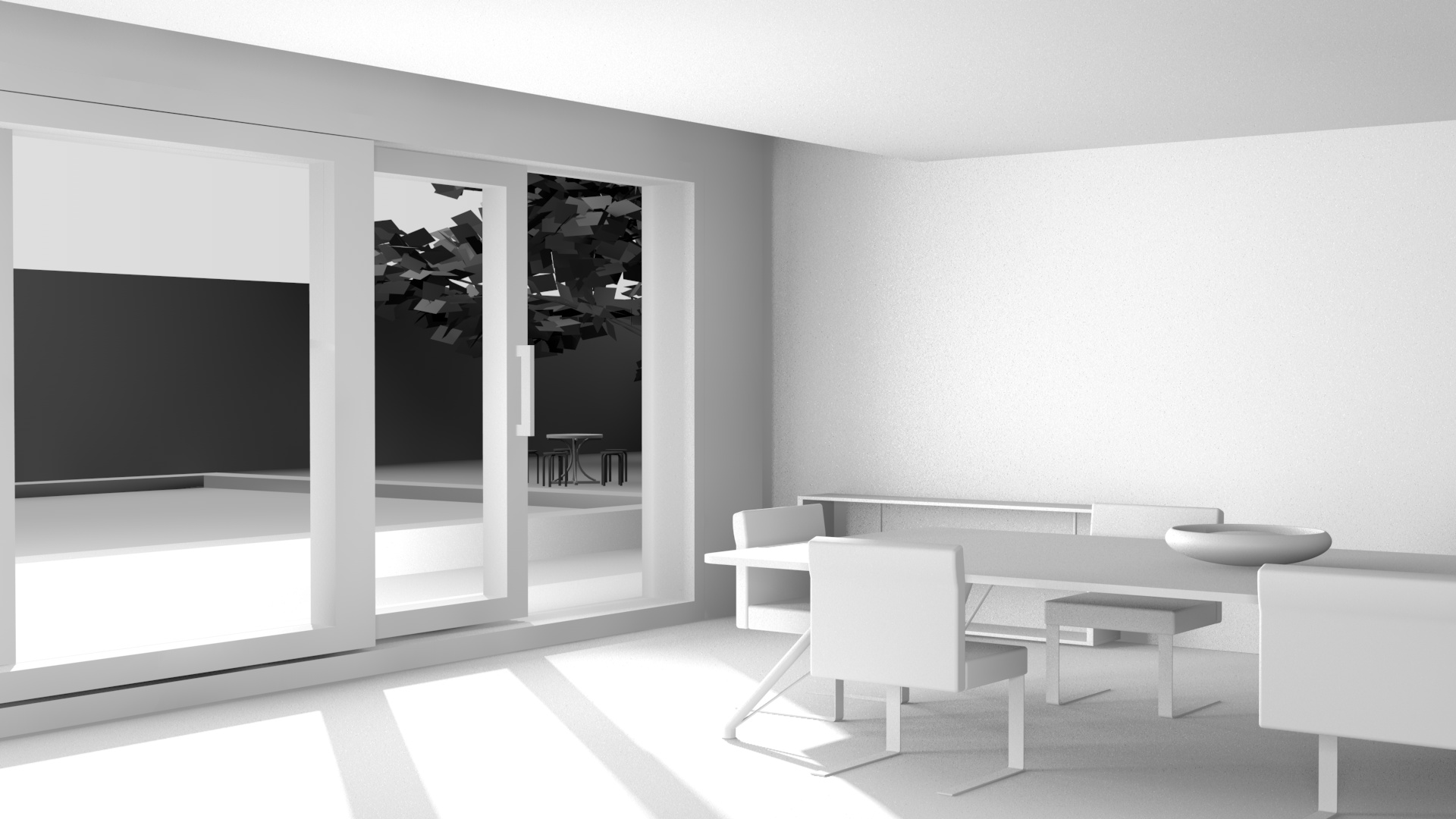 se lasci la porta aperta dovrai dare una leggera trasparenza in meno ai vetri per far notare la differenza di luminosita dove il sole illumina il pavimento direttamente...