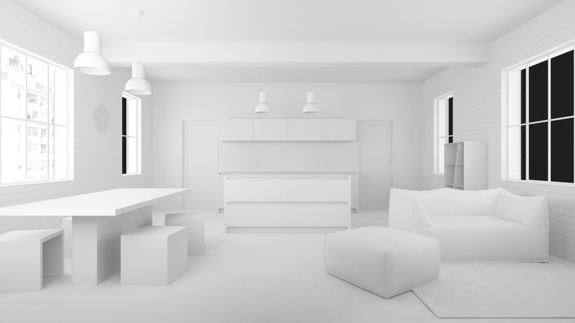 ora, da pianta ci sono queste finestre (posto un render dall'alto che ho fatto proprio sta mattina giusto x farvi vedere), probabilmente quella dove al momento ho messo la tv la chiudo, xchè mi da fastidio, sicuramente con una fonte in meno di luce usciranno i chiaro/scuri, ma cmq aspetto di vedere quando avrò completato il modello e scelto il pavimento, almeno il colore
