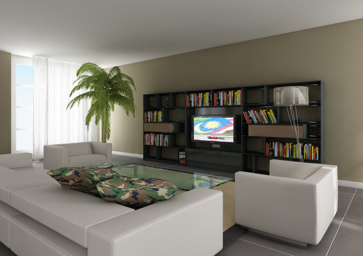 Il pavimento:quelle piastrelle rugose con una fuga da un cm non sono belle,rivedrei il tappeto che mi sembra molto rigido e non si capisce di cosa è fatto,i cuscini militari....... insomma non si integrano con il resto,rivedrei anche la pelle nei suoi speculari,troppi libri colorati stai nelle tonalità neutre como i bianco grigio nero.Non mi piace il tv acceso,ma questo è un mio gusto.La lampada non va bene in quella posizione,impalla la libreria,se usi piastrelle fai si che finiscano vicino allo zoccolino.Troppo soffitto bilancia l'immagine.Alle tende metti un binario o un bastone,se no sembrano attaccate con le puntine.Poi per la palma fai te se ti piace desatura il verde è molto acceso.Adesso mi puoi mandare a quel pease.A poi mentre osservavo ho visto degli strappi di texture sulle poltrone in pelle,diminuisci anche la mappatura della pelle,attenzione la base della poltrona taglia il tappeto.Ok adesso penso di averti detto alcune cose