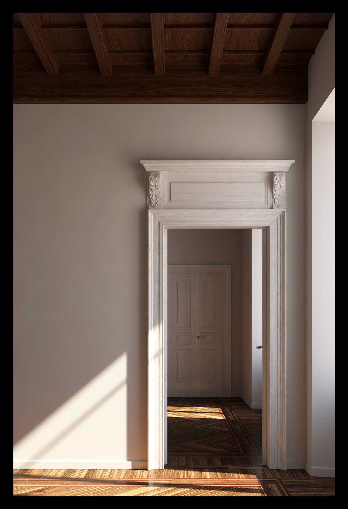 Oggi prosegue il mio lavoro! Ho completato la texturizzazione del soffitto. La riflessione non mi convince ancora, gli da un effetto troppo patinato e pulito che si discosta un po' dalla realtà. Per ora, non sapendo effettivamente ancora bene quali inquadrature andrò a fare, ed essendo il soffitto molto alto (si parla di h. 3.60 nel punto più basso), penso lo aggiusterò in seguito!