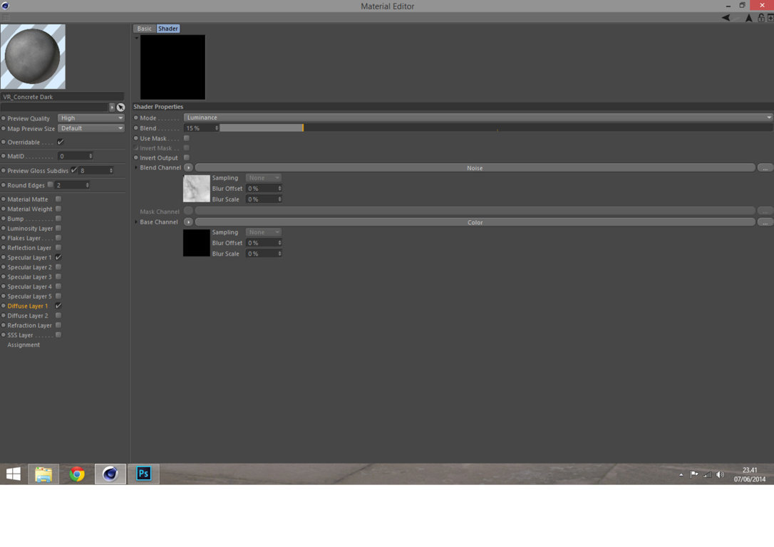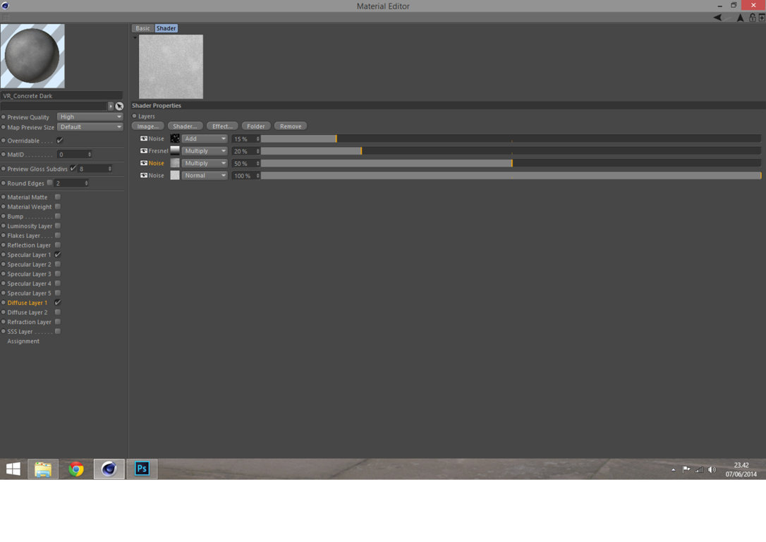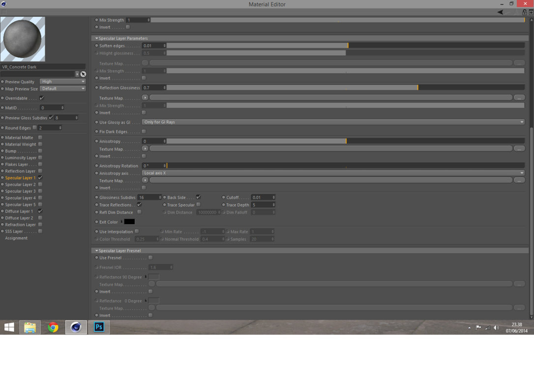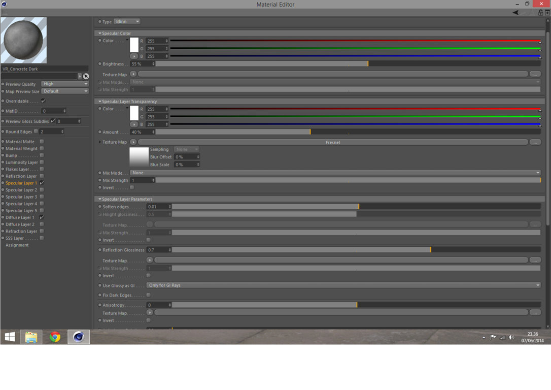 Per quanto riguarda il materiale pavimento da noob quale sono ho preso un materiale tipo roccia di quelli che ha cinema di preset e poi ho provato ad aggiungerci uno specular layer 1 con i valori sotto riportati...