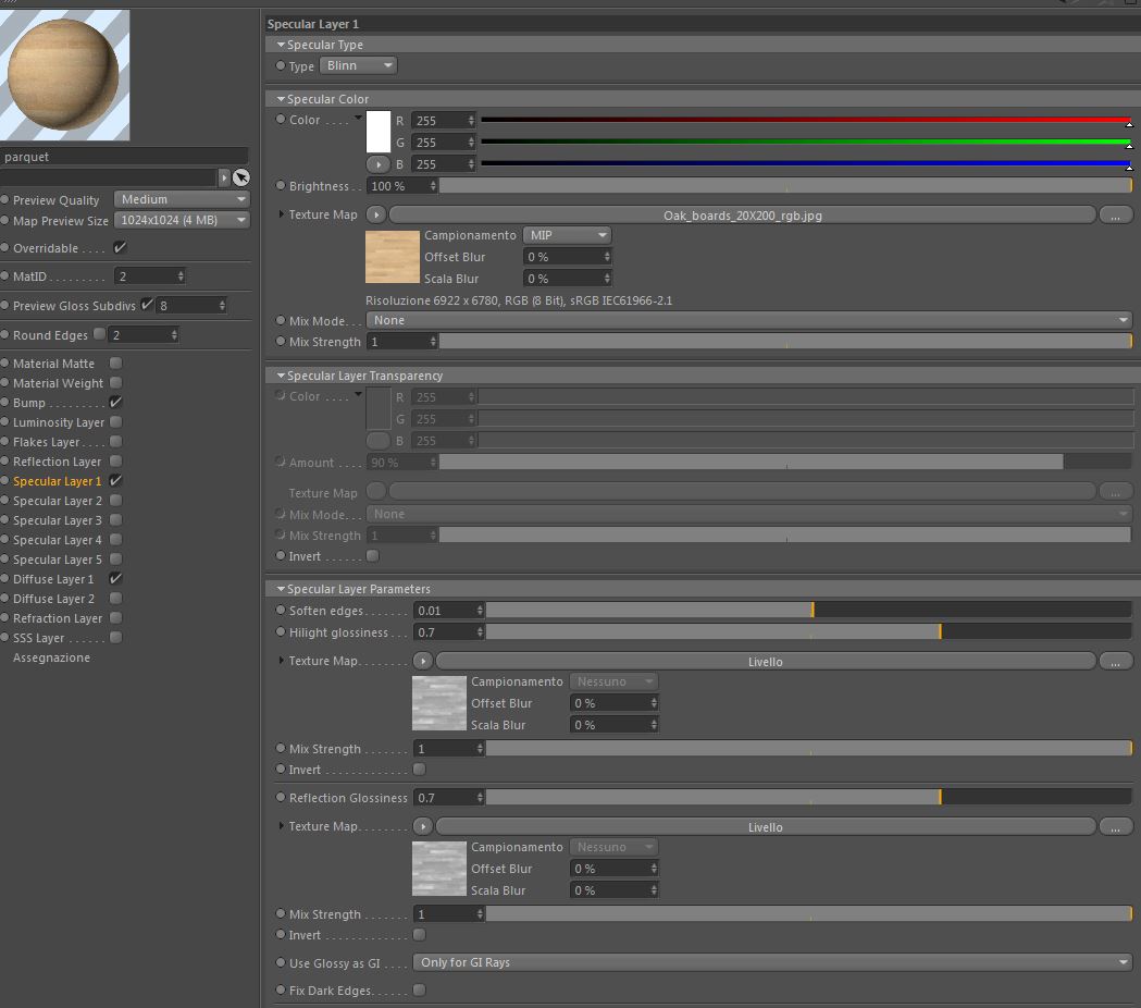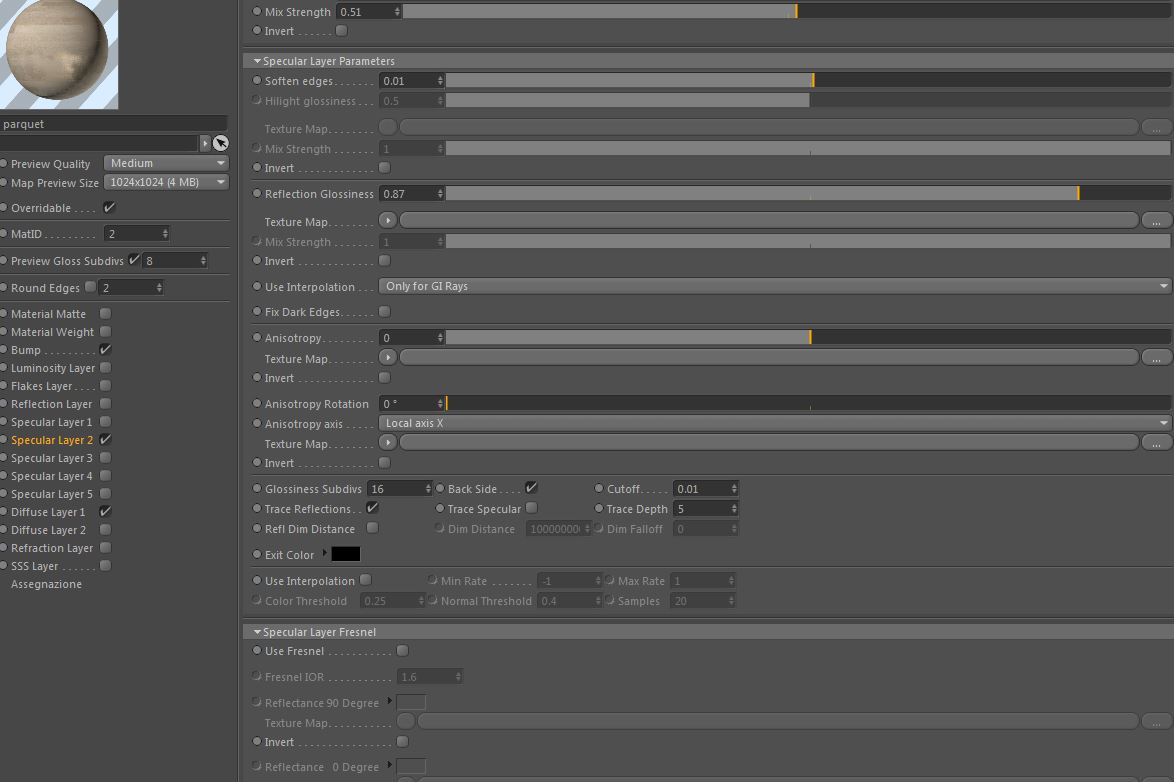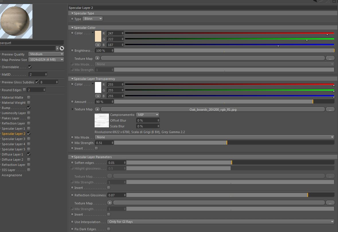 Ciao marcuiz77, ho dato un'occhiata ai parametri della texture parquet e volevo avvisarti che nel canale Specular Layer Transparency c'è ancora la necessità d'invertire la mappa che carichi nel canale texture a cui poi applicherei un filtro per renderla più scura onde abbassare la riflessione, che altrimenti risulterebbe quasi a specchio. Dalla versione 1.8 in poi hanno solo corretto il canale bump che non necessita più dell'inversione, mentre per i canali dello Specular la cosa non è stata modificata (chissà il perchè poi, boh).