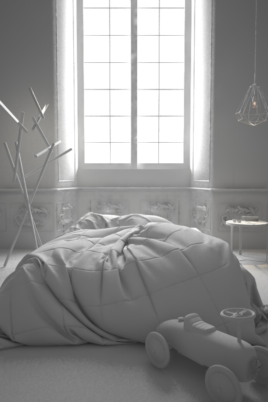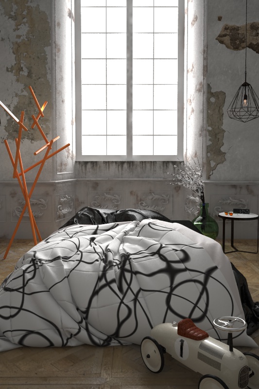 l'idea era quella di contrapporre il vecchio/antico dato dall'architettonico con il moderno/pulito dato dall'arredo(lampade, letto, occhiali..)